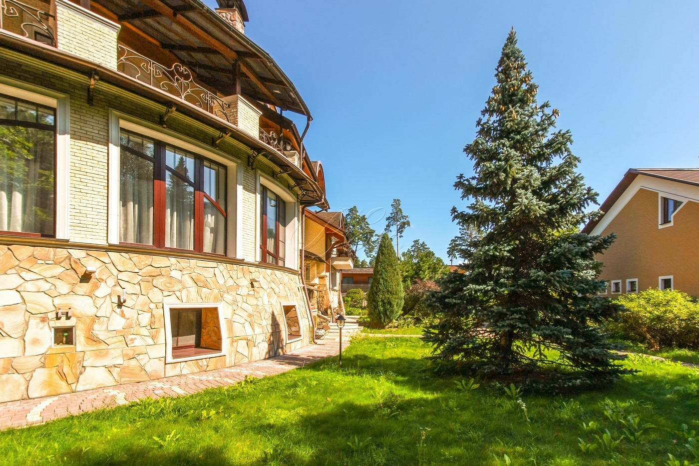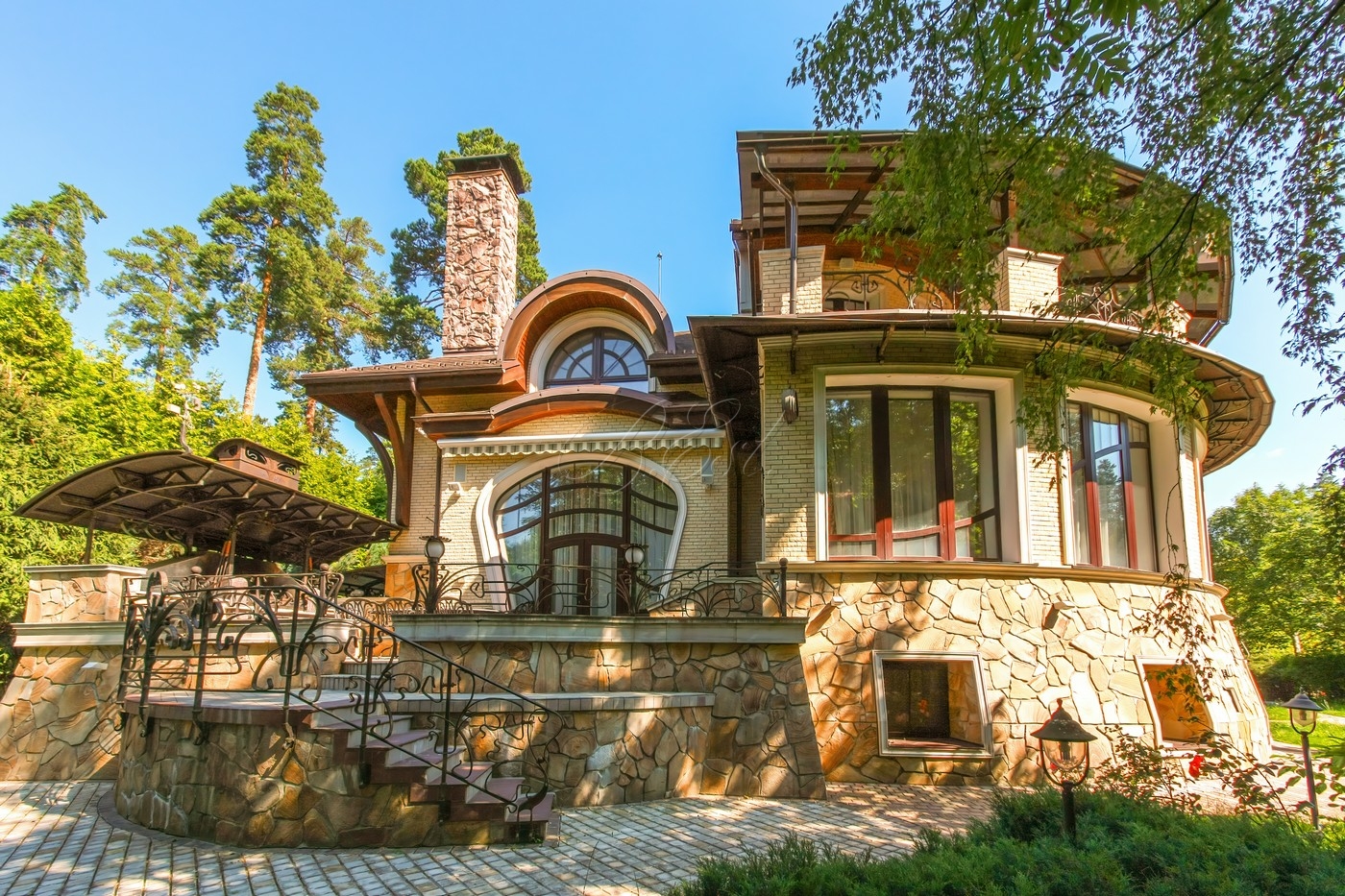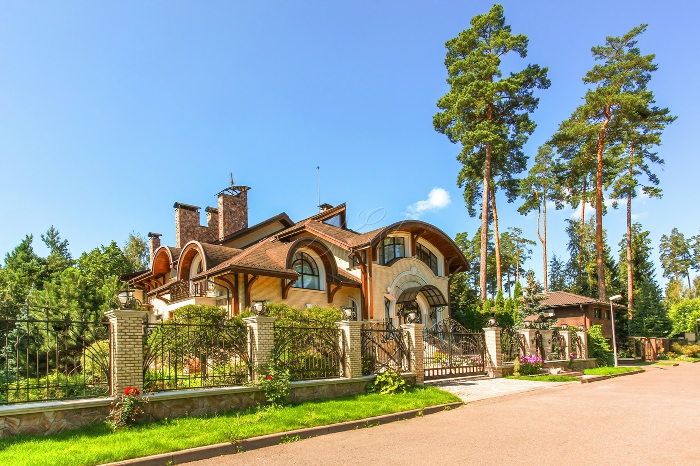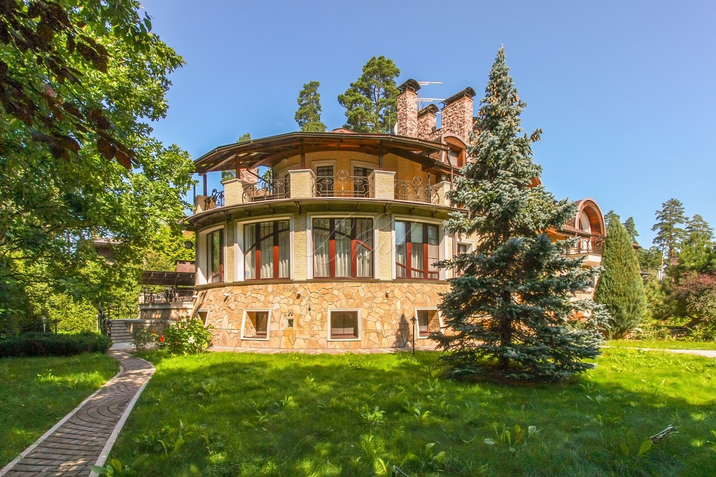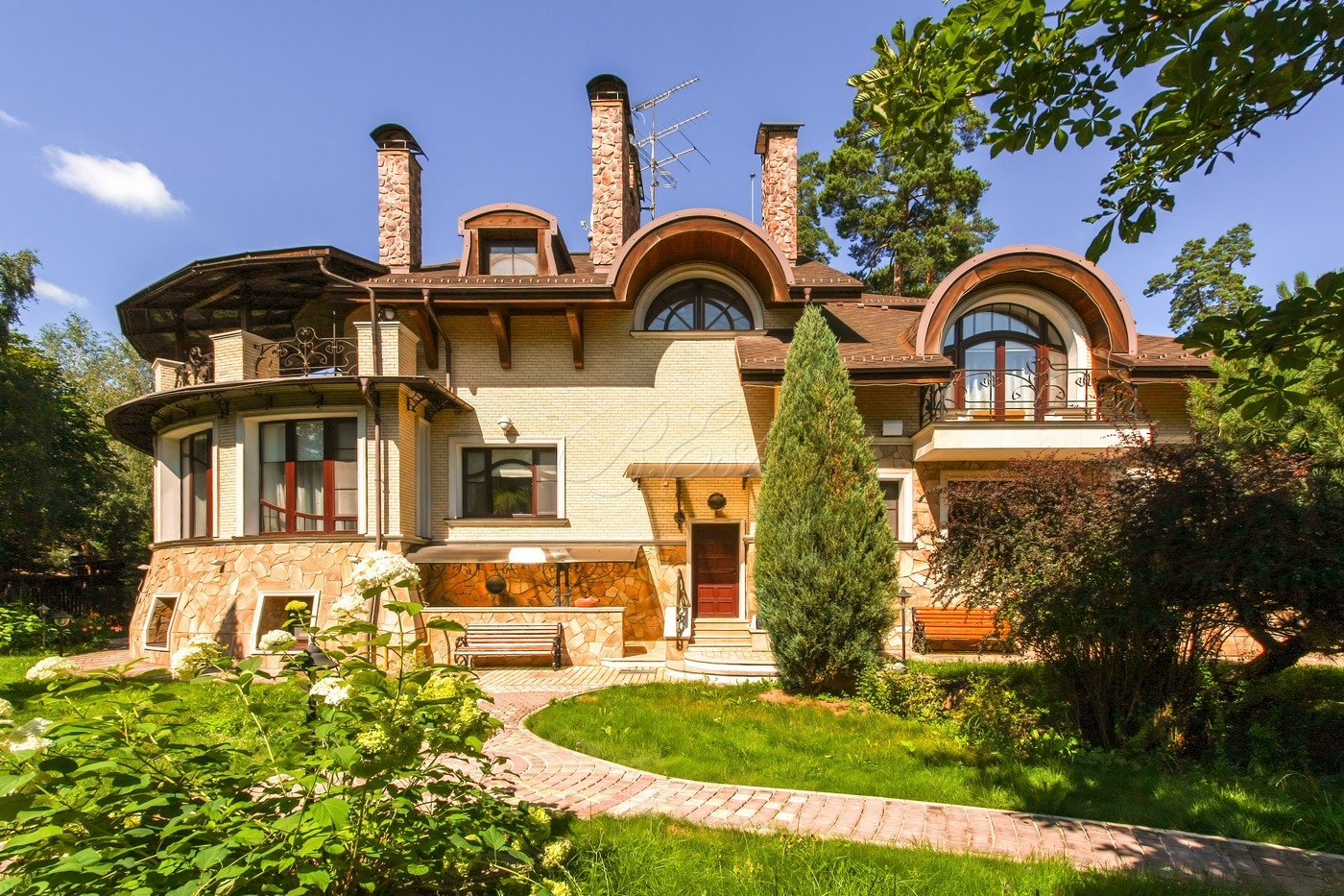 Объект 25026. Продается дом в коттеджном поселке "Лесные Дали-3" с выходом в пансионат "Лесные Дали" управ. делами. Великолепный кирпичный дом с элементами стиля модерн, в прекрасном состоянии. Внутри - высокие потолки и дорогая мебель из Европы. Удобная планировка первого этажа предусматривает просторную гостиную с живописным летним патио и лежаками, смотрящими на хвойный лес, кухню, столовую, гостевой санузел, гардеробную и гараж на 2 авто. На втором этаже большая мастер-спальня с собственной гардеробной и просторным санузлом, большой балкон с видом на хвойный лес, 2 детские спальни со своими гардеробными и санузлами, а также кабинет-библиотека. В цоколе располагается SPA-зона с сауной, джакузи и комнатой отдыха, квартира для персонала с собственными кухней и санузлом.