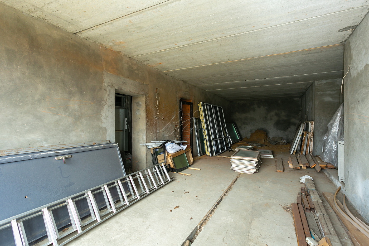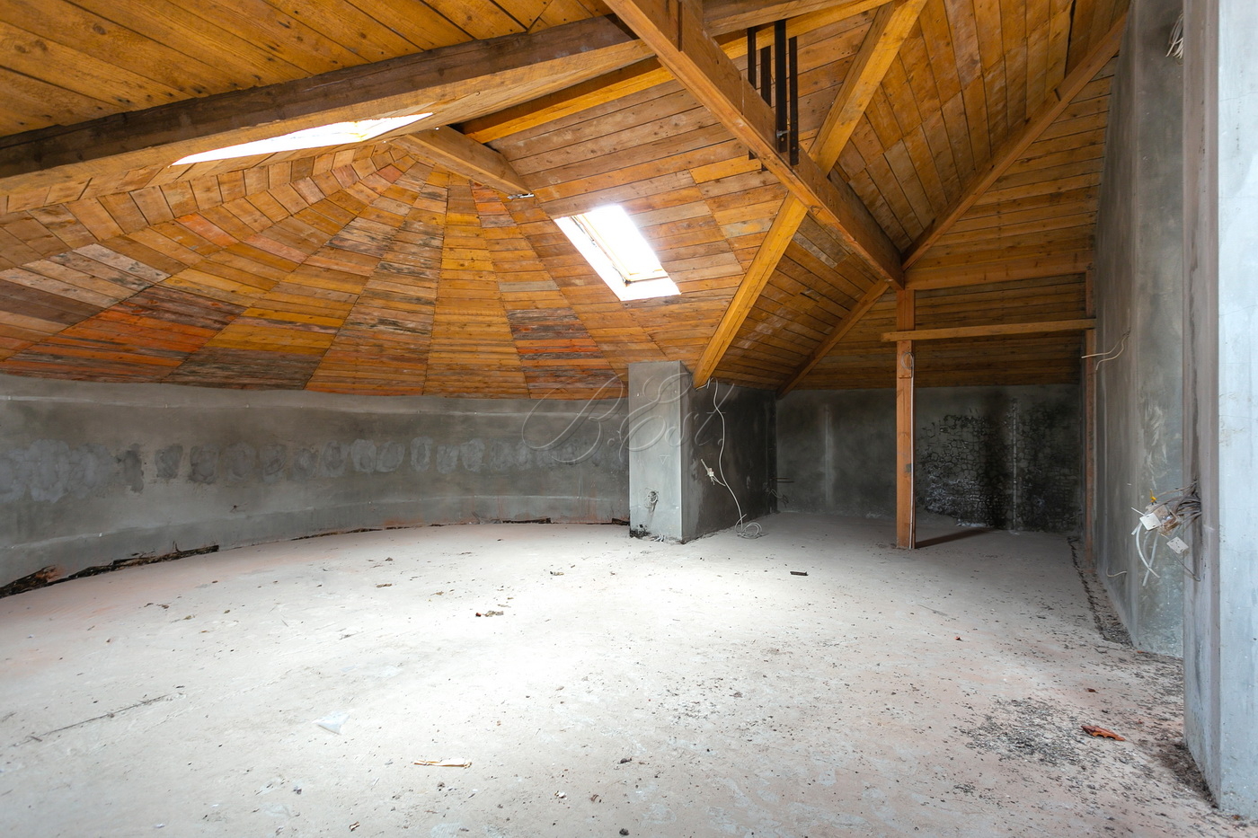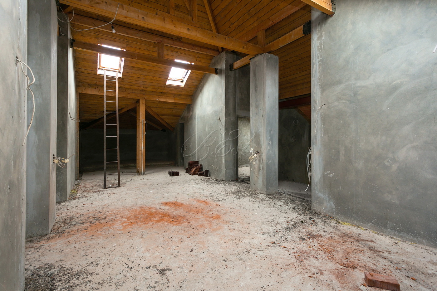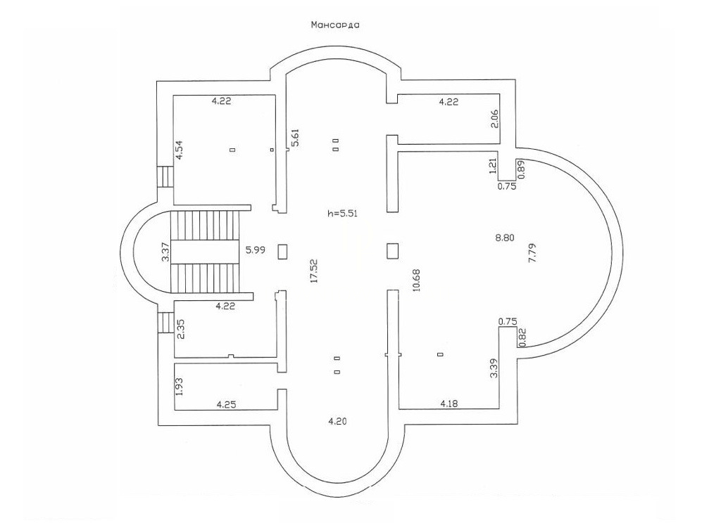 На цокольном этаже предусмотрен гараж, место для сауны, подъемник для кухни и технические помещения, включая бойлерную. На первом этаже находятся гостиная, кухня, кабинет (или гостевая спальня), гостевой санузел и несколько технических помещений. Второй этаж являет собой спальную зону: мастер-спальня с собственным санузлом и гардеробной и две изолированные спальни. Мансарда разделена на помещения для проведения досуга и игровую.