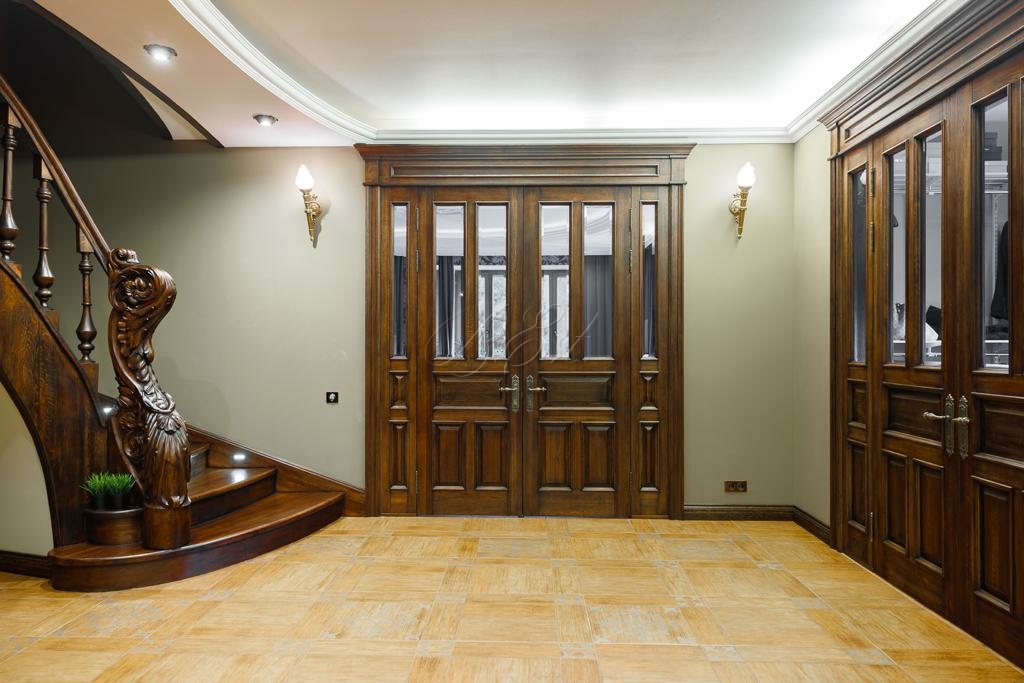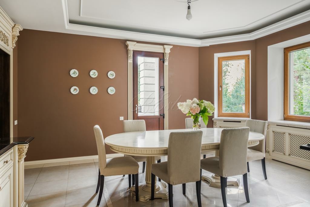 Все коммуникации в доме центральные, осуществляется фильтрация воды и воздуха, ведется видеонаблюдение. Фундамент - монолитный, кровля - мягкая, натуральный камень на фасадах. В отделке использованы массив дуба, латунь, керамогранит, декоративная штукатурка, гипсовая лепнина.