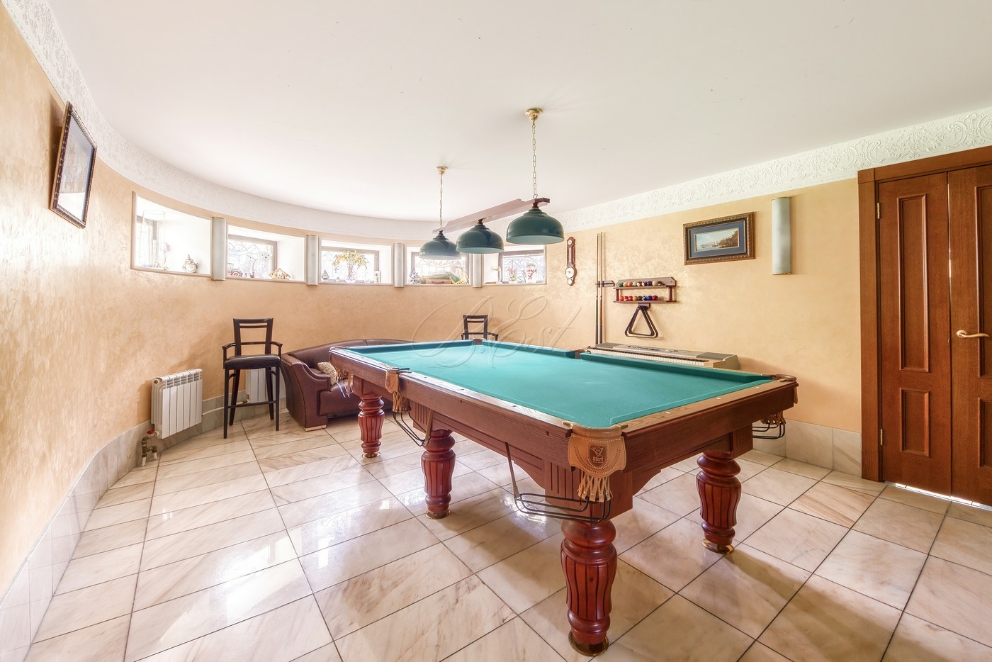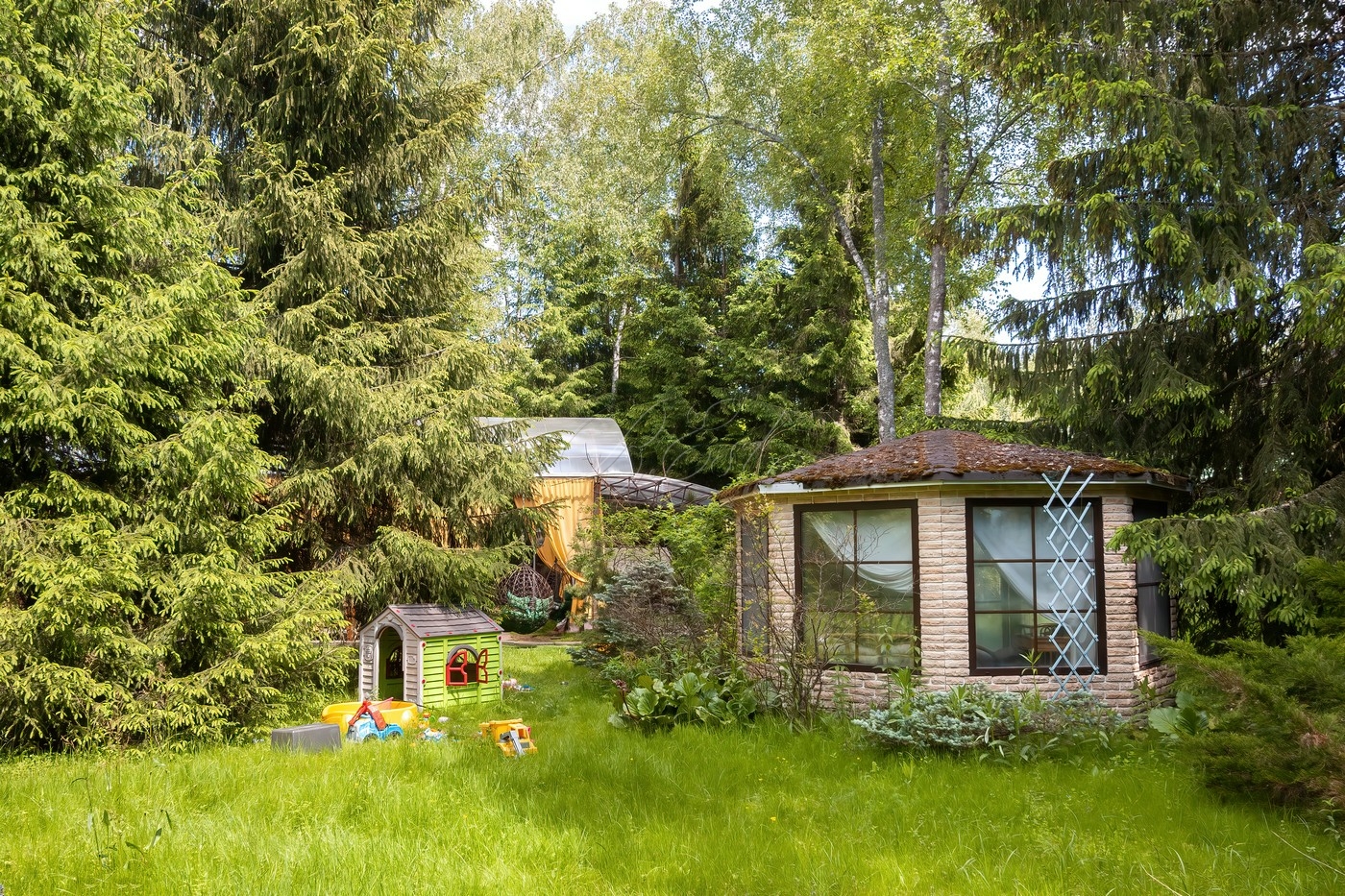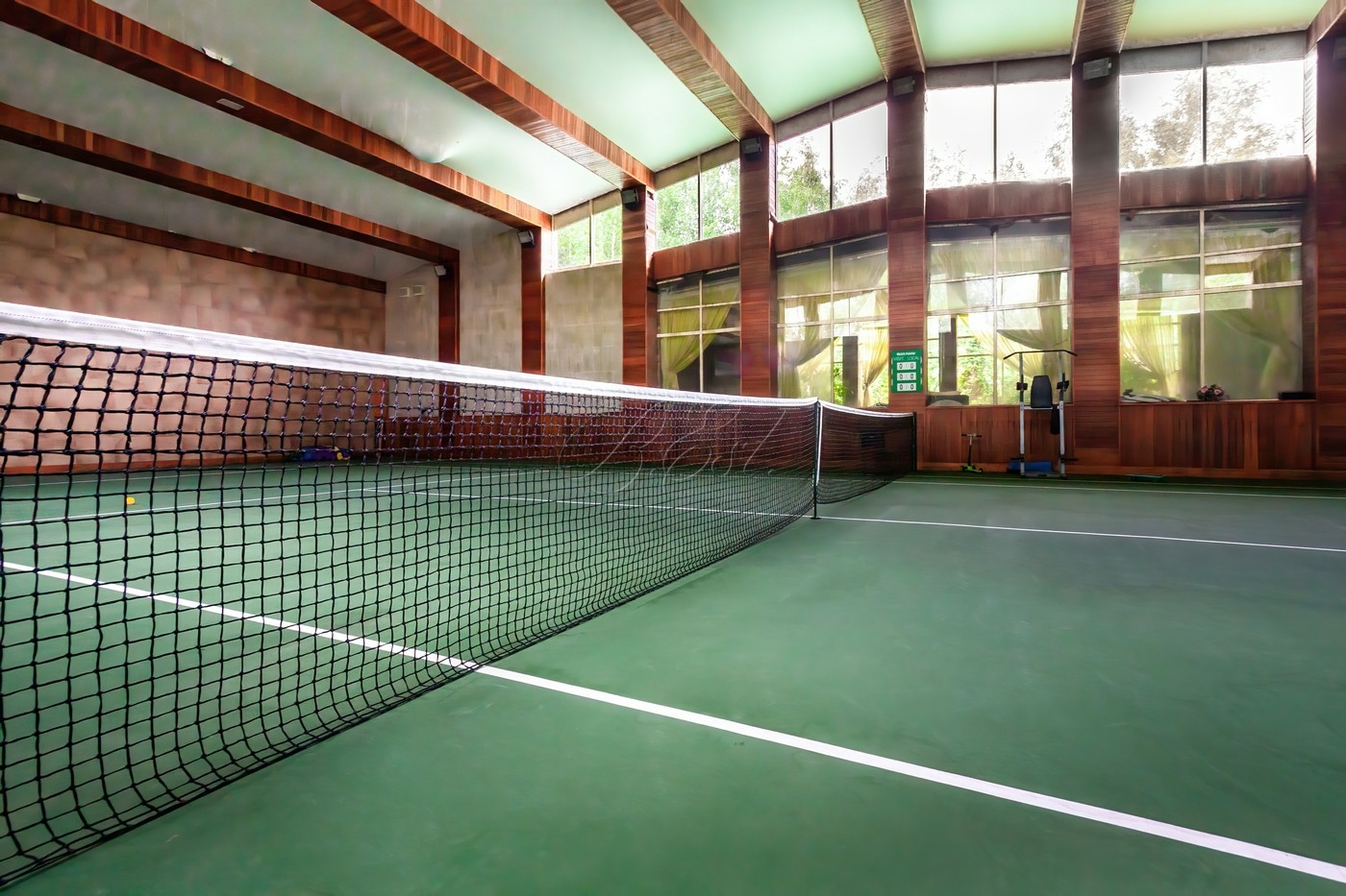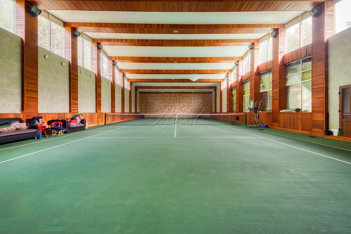Объект 29804. На роскошном лесном участке 48 соток продается современный особняк со своим спорткомплексом. Основой дом: в цоколе есть бильярдная, кинозал, постирочная, кладовая, санузел; 1 этаж - гостиная, кухня, столовая, спальня со своим санузлом, гостевой санузел; 2 этаж - 2 спальни с санузлами, кабинет, игровая; мансарда - спальня с санузлом и гардеробной. Над уличной обеденной (в т.ч. для барбекю/гриля) зоной возведен непромокаемый навес, вокруг подвесные коконы. Также на участке построена дровяная баня/сауна с душевой и комнатой отдыха. Отдельно: крытый гараж, стоянка для авто, детская горка. Но основной изюминкой является собственный спортивный комплекс (!), который включает в себя теннисный корт, бассейн и раздевалку.