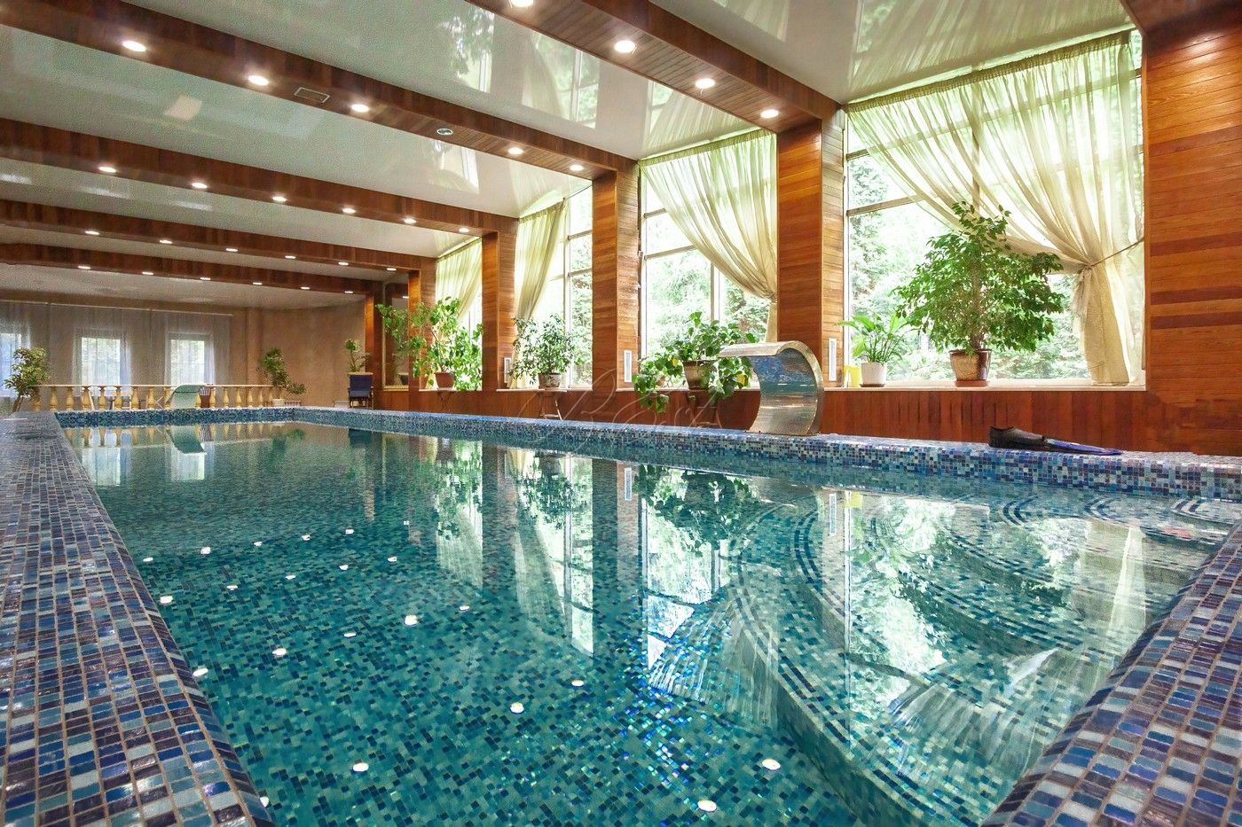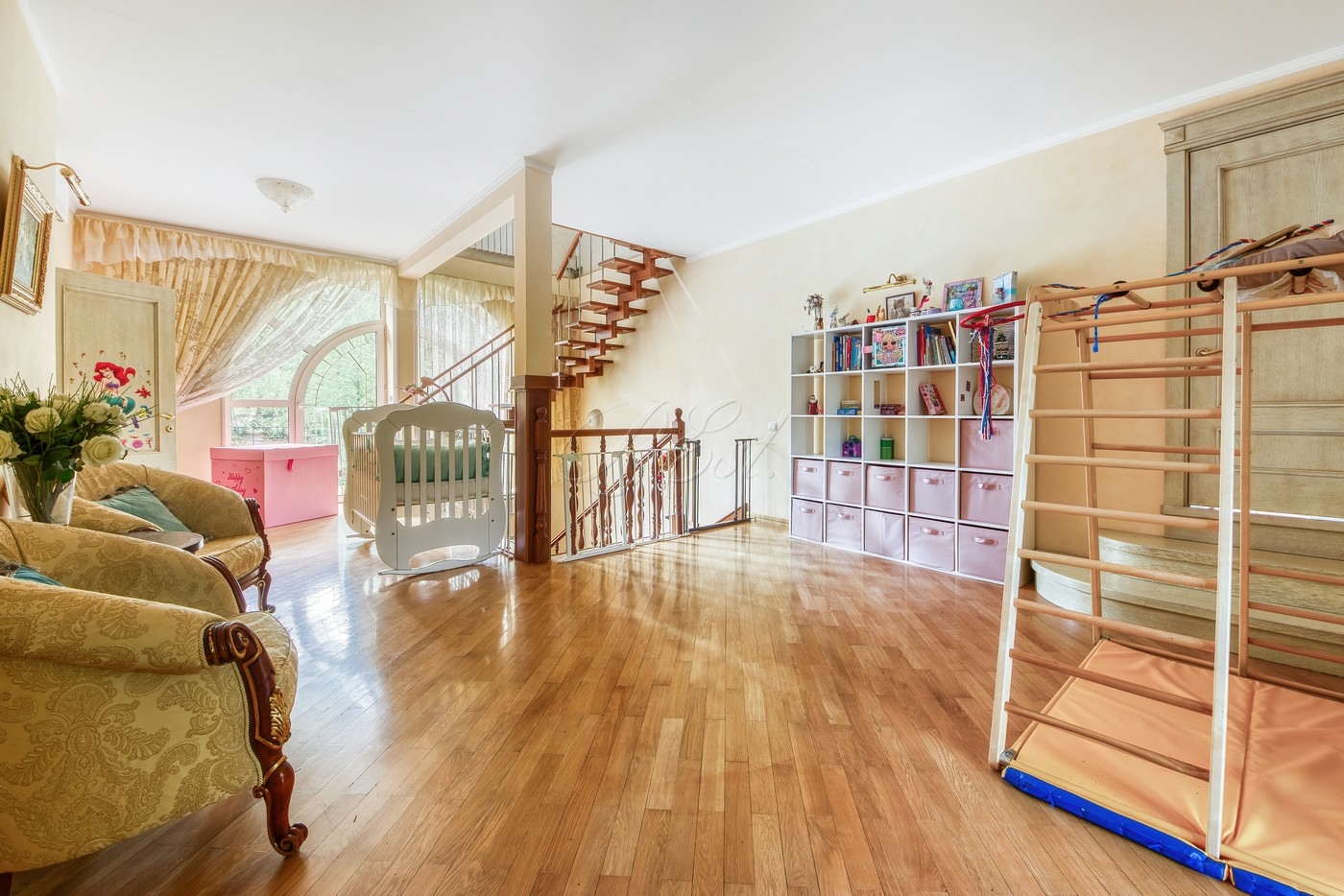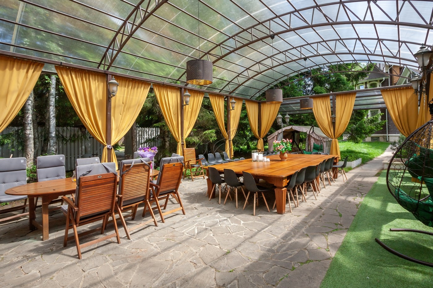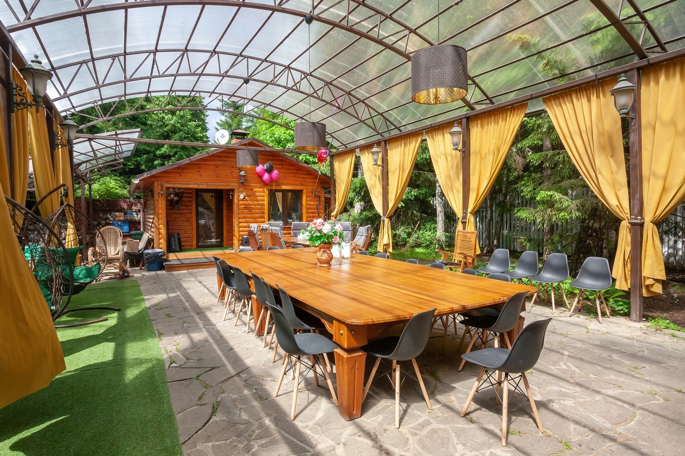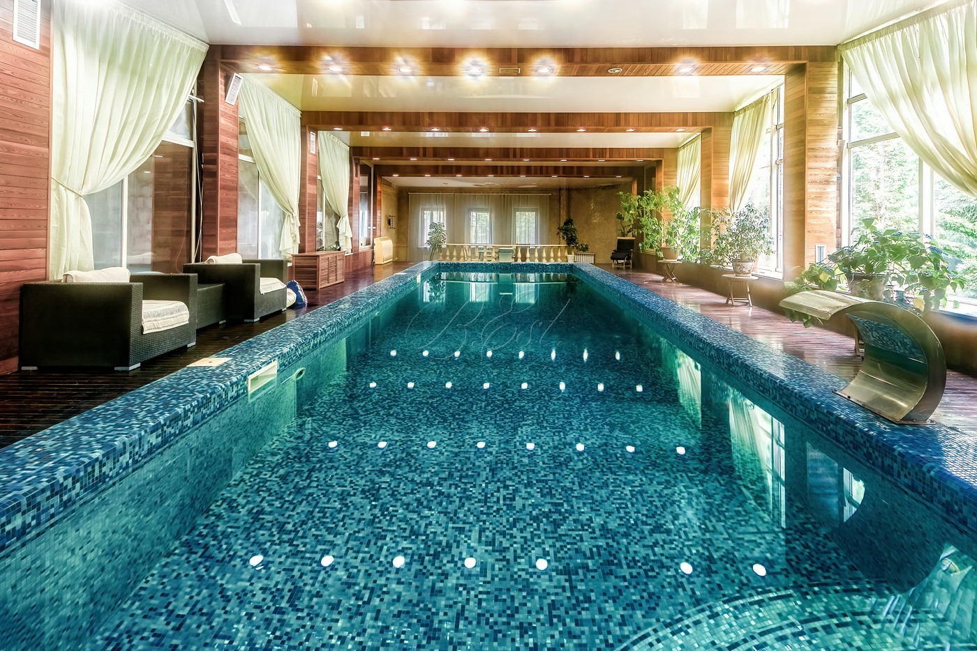 Объект 29804. На роскошном лесном участке 48 соток продается современный особняк со своим спорткомплексом. Основой дом: в цоколе есть бильярдная, кинозал, постирочная, кладовая, санузел; 1 этаж - гостиная, кухня, столовая, спальня со своим санузлом, гостевой санузел; 2 этаж - 2 спальни с санузлами, кабинет, игровая; мансарда - спальня с санузлом и гардеробной. Над уличной обеденной (в т.ч. для барбекю/гриля) зоной возведен непромокаемый навес, вокруг подвесные коконы. Также на участке построена дровяная баня/сауна с душевой и комнатой отдыха. Отдельно: крытый гараж, стоянка для авто, детская горка. Но основной изюминкой является собственный спортивный комплекс (!), который включает в себя теннисный корт, бассейн и раздевалку.