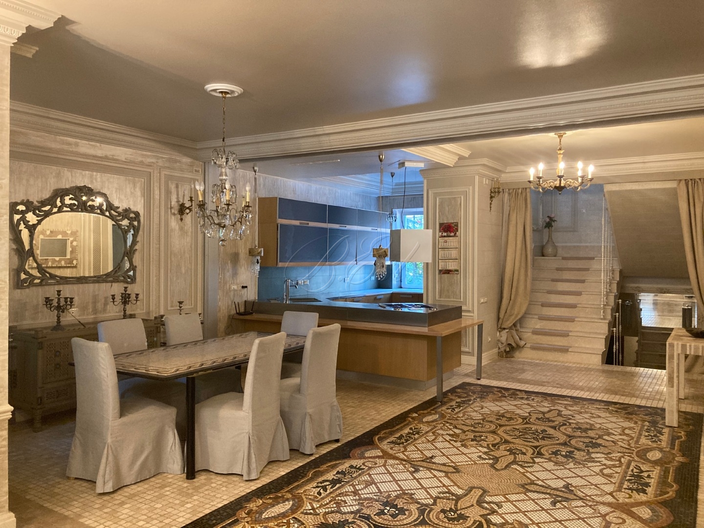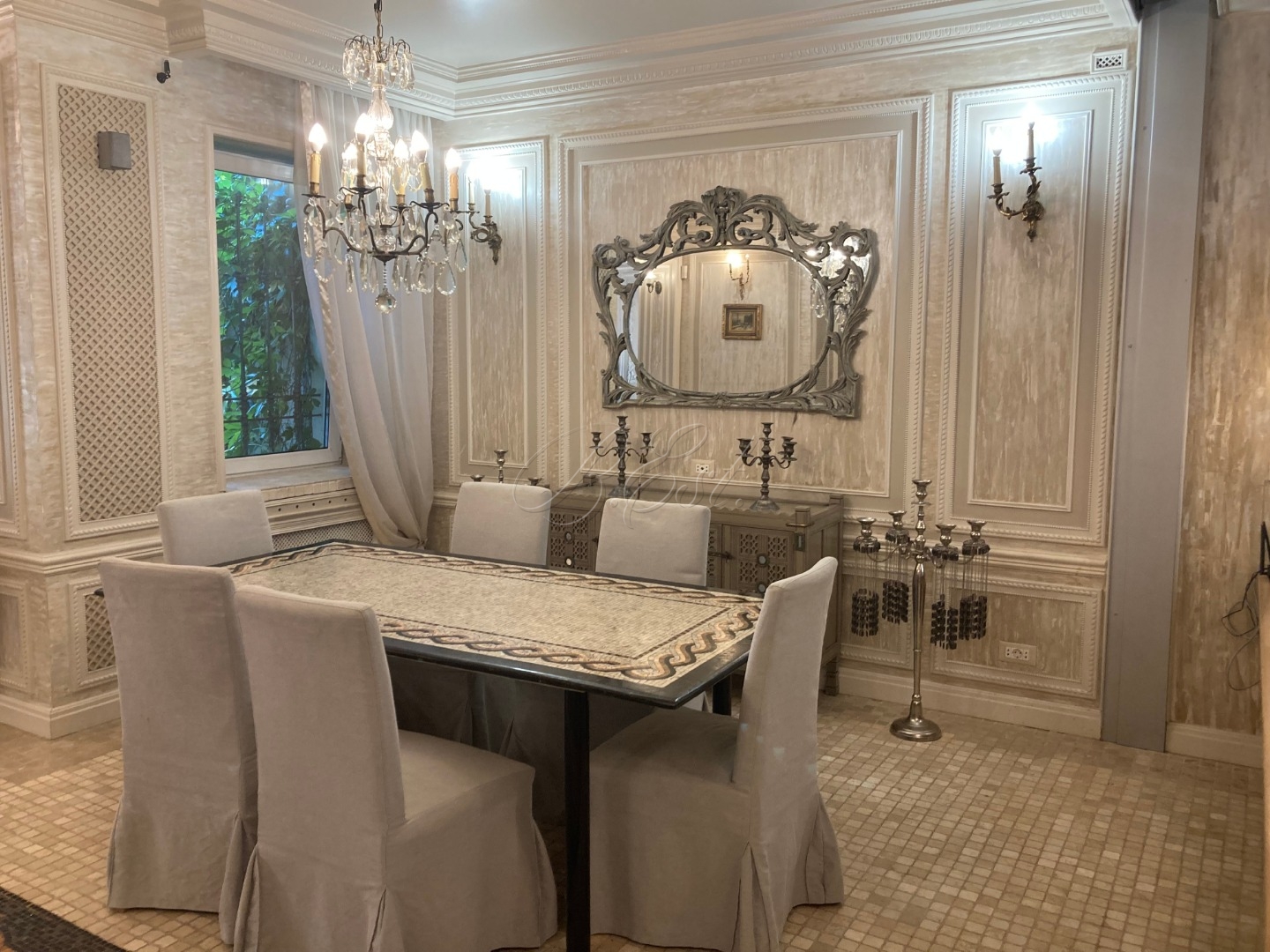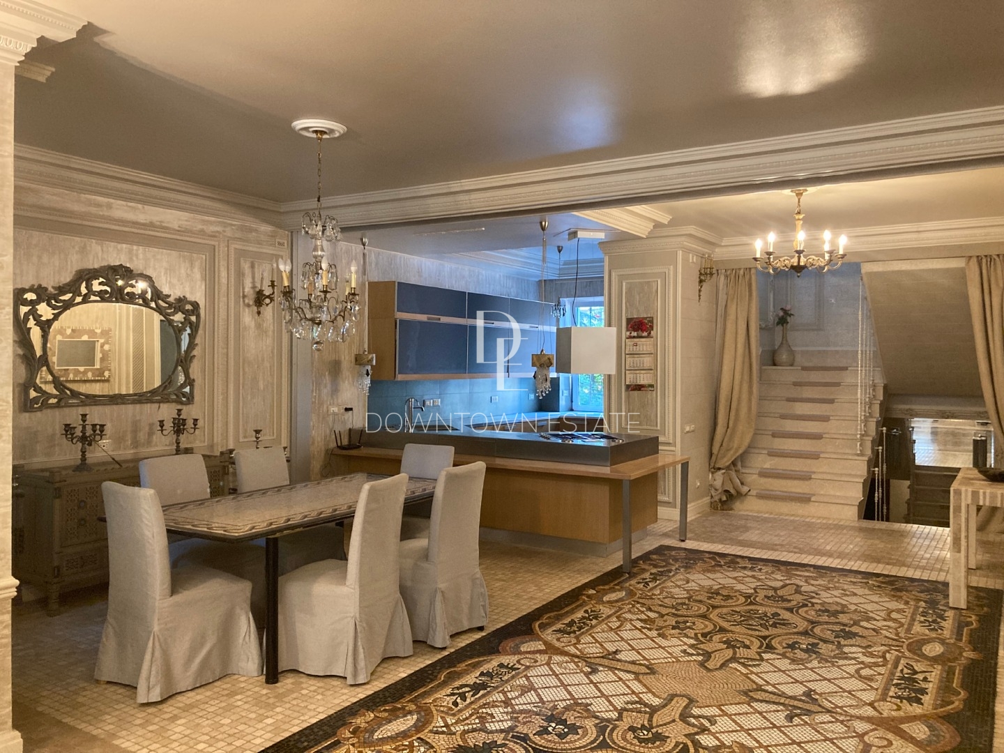 Объект 26213. Предлагается изысканный таунхаус с дизайнерским ремонтом, дорогой европейской мебелью и уютным двориком в 6 соток. Попадая внутрь, удивляешься тому, какое большое пространство может скрывать компактный снаружи таунхаус. На первом этаже оборудована огромная гостиная с выходом на летнее патио, камином и высокими потолками (под 3,8 метра). В интерьере гостиной использованы натуральные мрамор и лепнина, фрески, ценные породы дерева, мебель, привезенная из Италии. Далее - столовая и кухня. При входе - холл, гардеробная, гостевой санузел, отдельный блок, включающий спальню со своим выходом во двор, санузлом и кухней (для персонала, либо тех членов семьи, которые не могут подняться на второй этаж). На втором этаже оборудованы 2 мастер-спальни с большими гардеробными и санузлами. На третьем этаже - спальня-кабинет с санузлом. В цоколе зона SPA с хаммамом, сауной и комнатой отдыха, а также гардеробная, кладовая, санузел, возможная квартира для персонала. При входе на участок - дом охраны.
