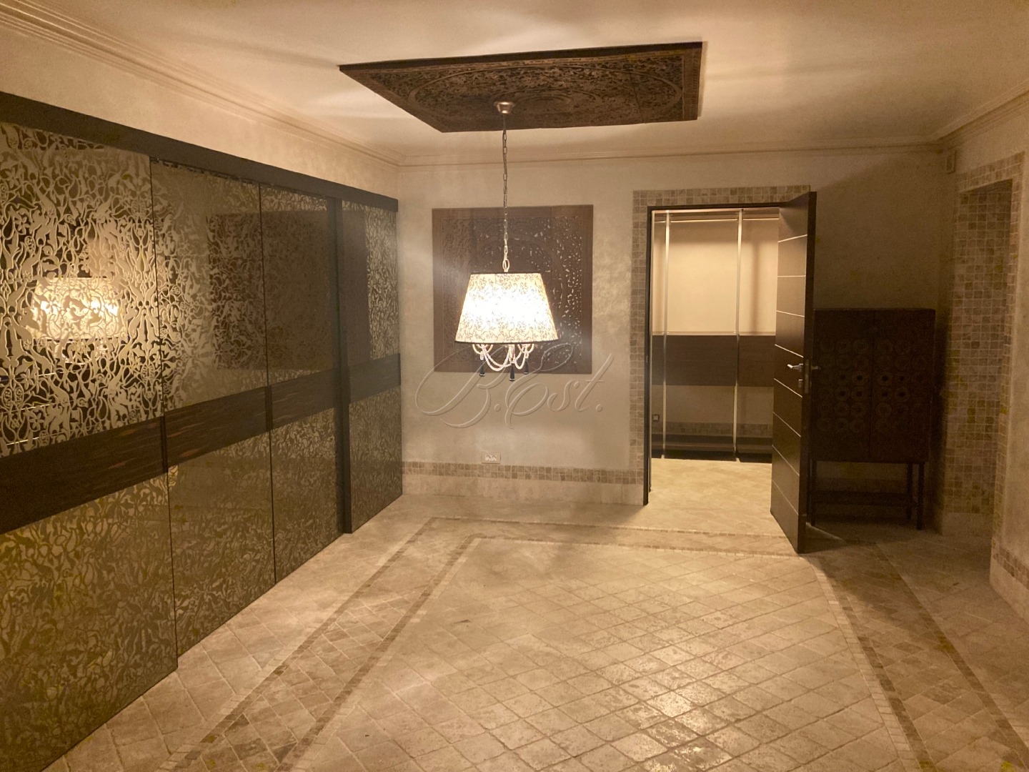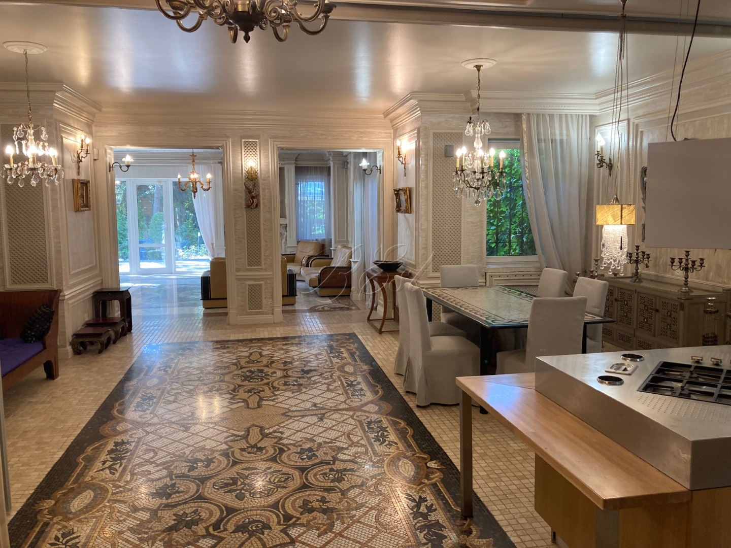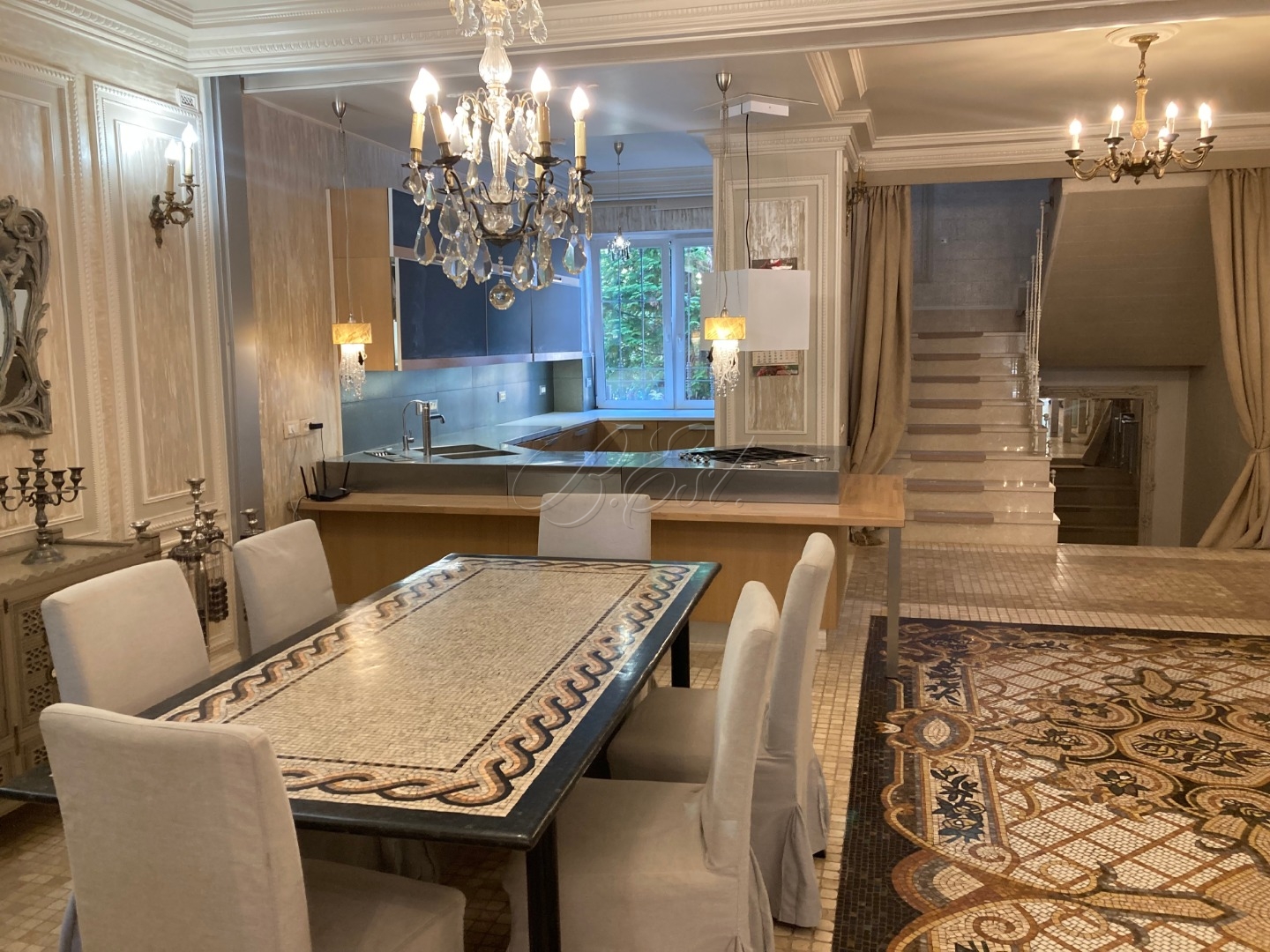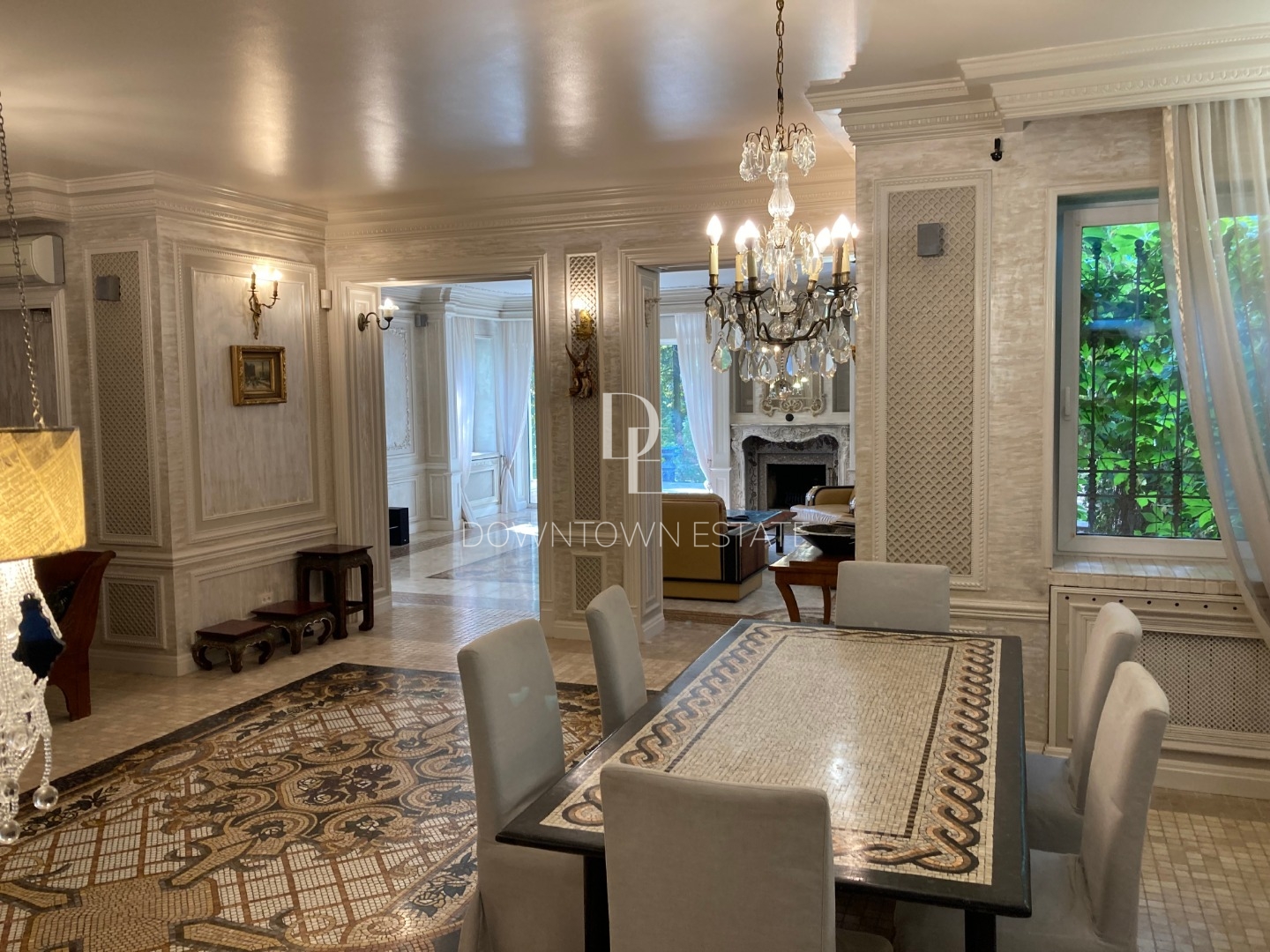 Объект 26213. Предлагается изысканный таунхаус с дизайнерским ремонтом, дорогой европейской мебелью и уютным двориком в 6 соток. Попадая внутрь, удивляешься тому, какое большое пространство может скрывать компактный снаружи таунхаус. На первом этаже оборудована огромная гостиная с выходом на летнее патио, камином и высокими потолками (под 3,8 метра). В интерьере гостиной использованы натуральные мрамор и лепнина, фрески, ценные породы дерева, мебель, привезенная из Италии. Далее - столовая и кухня. При входе - холл, гардеробная, гостевой санузел, отдельный блок, включающий спальню со своим выходом во двор, санузлом и кухней (для персонала, либо тех членов семьи, которые не могут подняться на второй этаж). На втором этаже оборудованы 2 мастер-спальни с большими гардеробными и санузлами. На третьем этаже - спальня-кабинет с санузлом. В цоколе зона SPA с хаммамом, сауной и комнатой отдыха, а также гардеробная, кладовая, санузел, возможная квартира для персонала. При входе на участок - дом охраны.