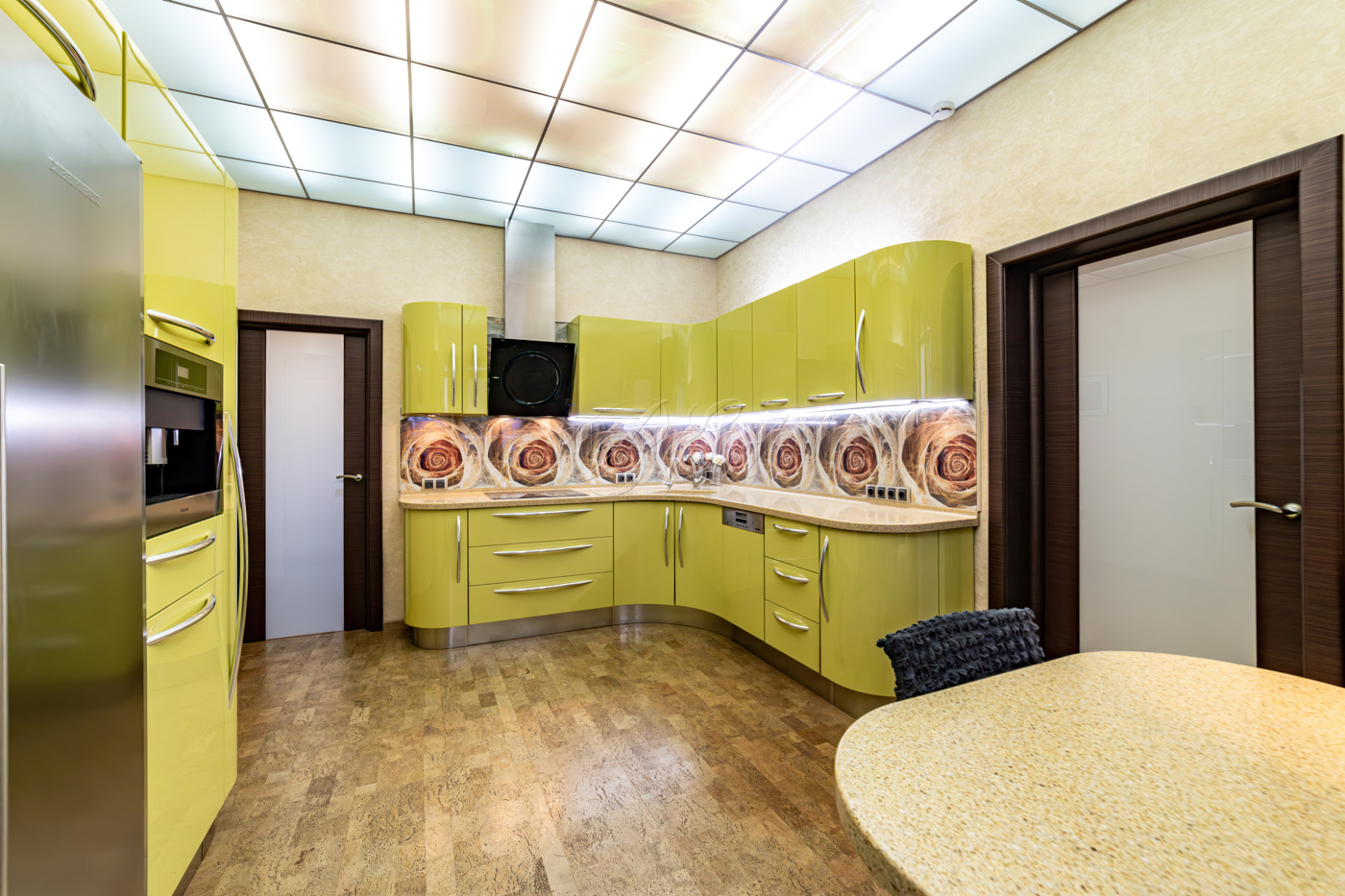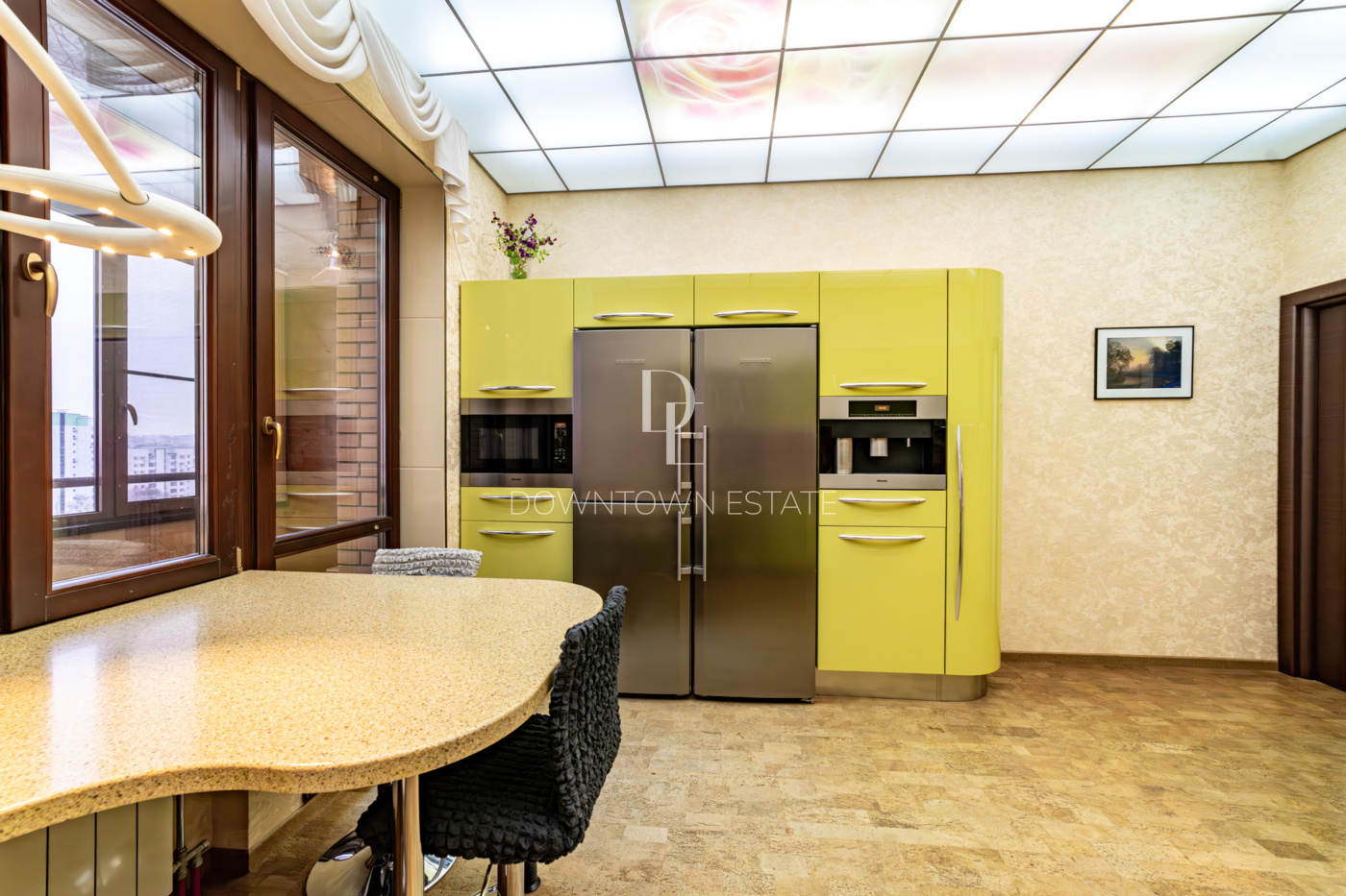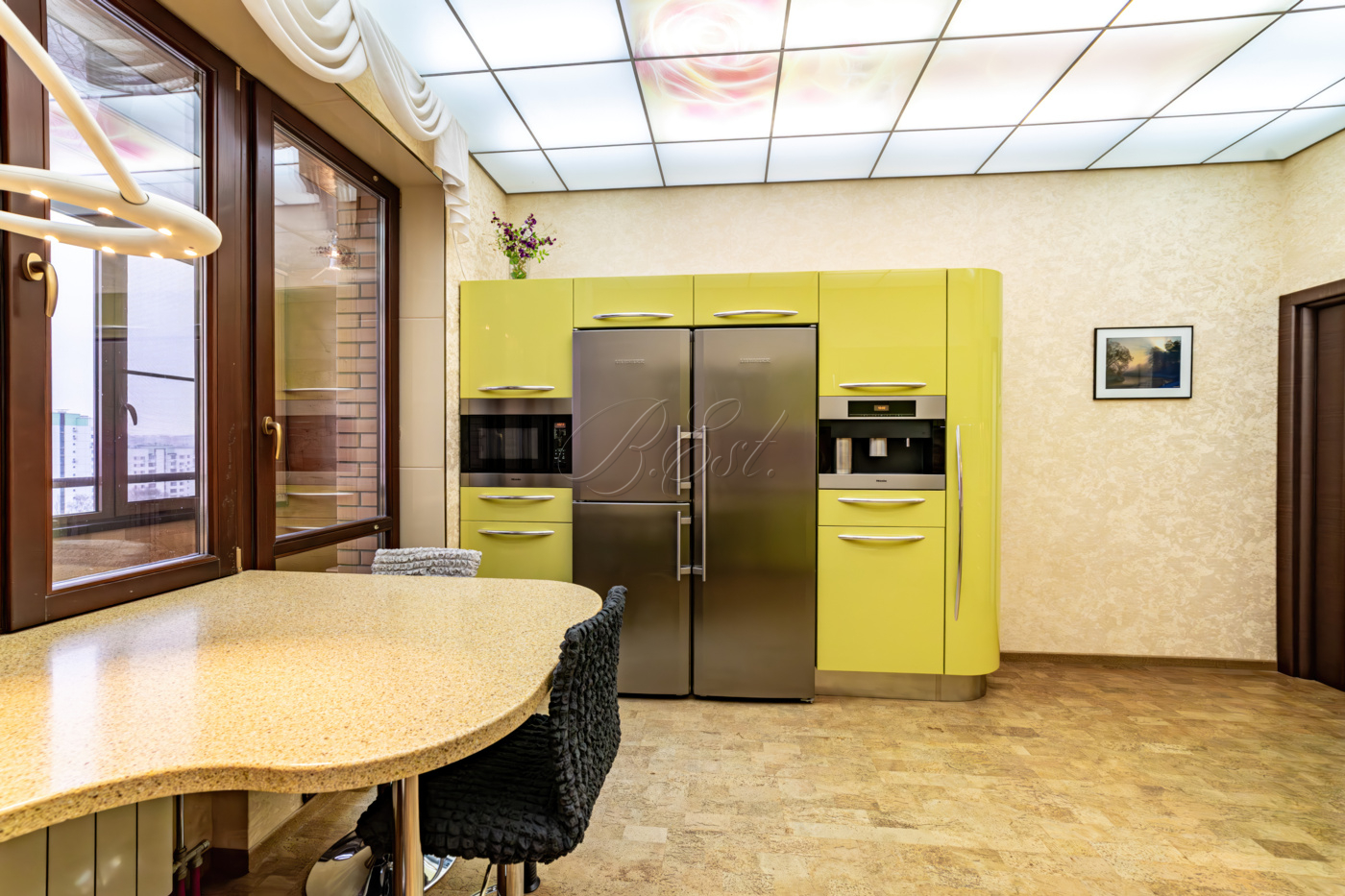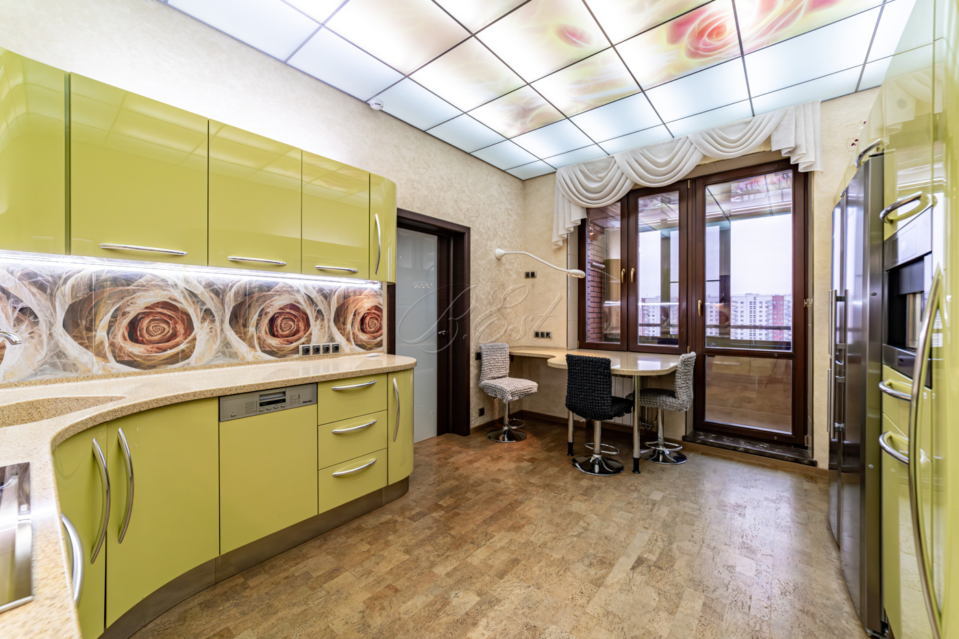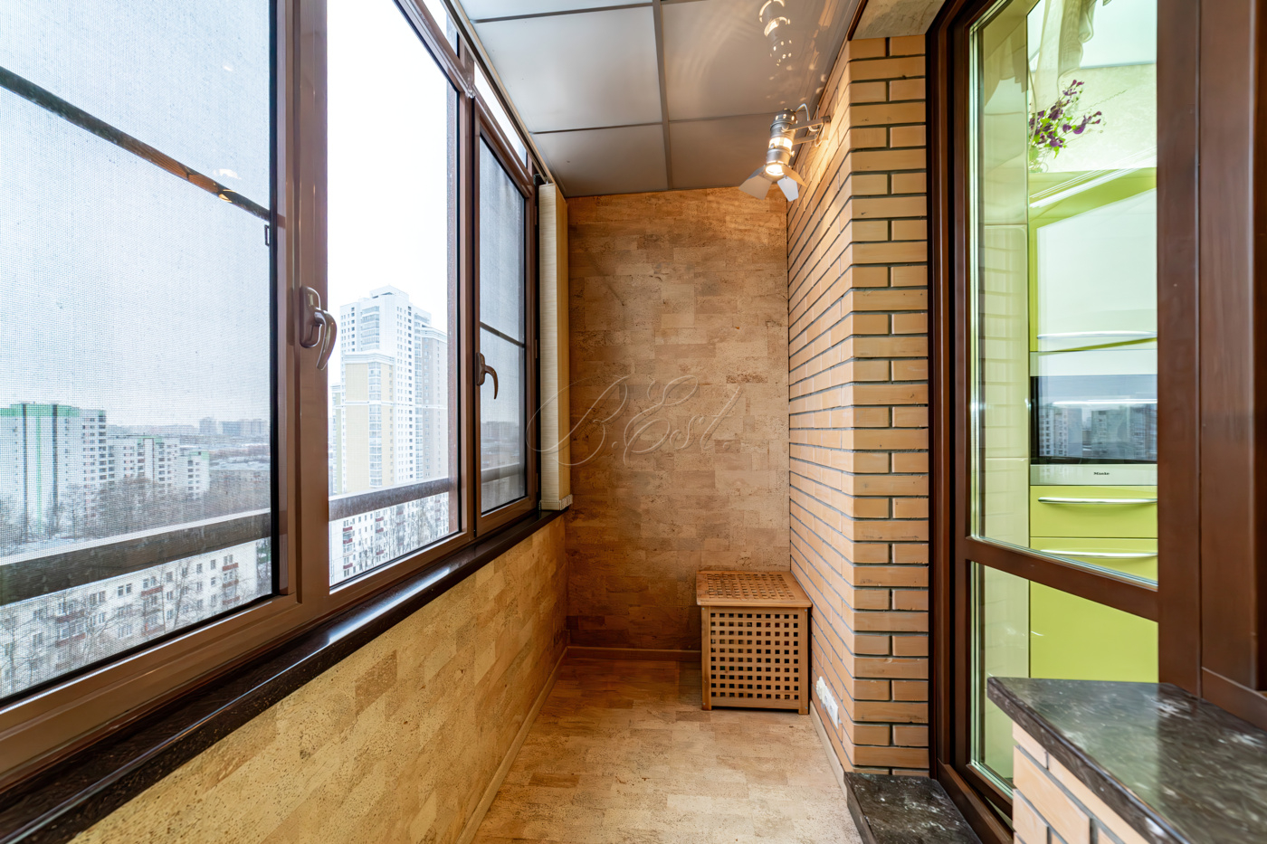 В отделке использованы высококачественные и долговечные материалы, выполнена шумоизоляция. Оригинальным решением является использование напольного покрытия из натуральной пробки во всех помещениях. Кухня со встроенной техникой: варочная поверхность Bosch, встраиваемые микроволновая печь и кофемашина Miele, вместительный холодильник Liebherr. Помещение постирочной со стиральной и сушильной машиными Miele. Душевая кабина Jacuzzi. Кондиционеры Daikin. Приточно-вытяжная система вентиляции с рекуперацией. Система очистки воды, охранная сигнализация.