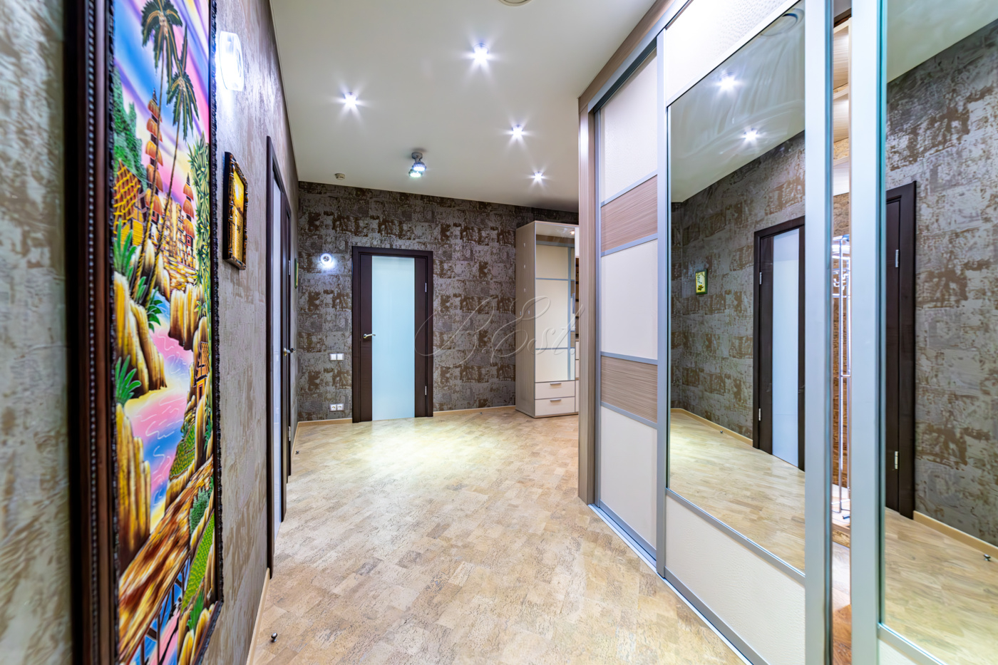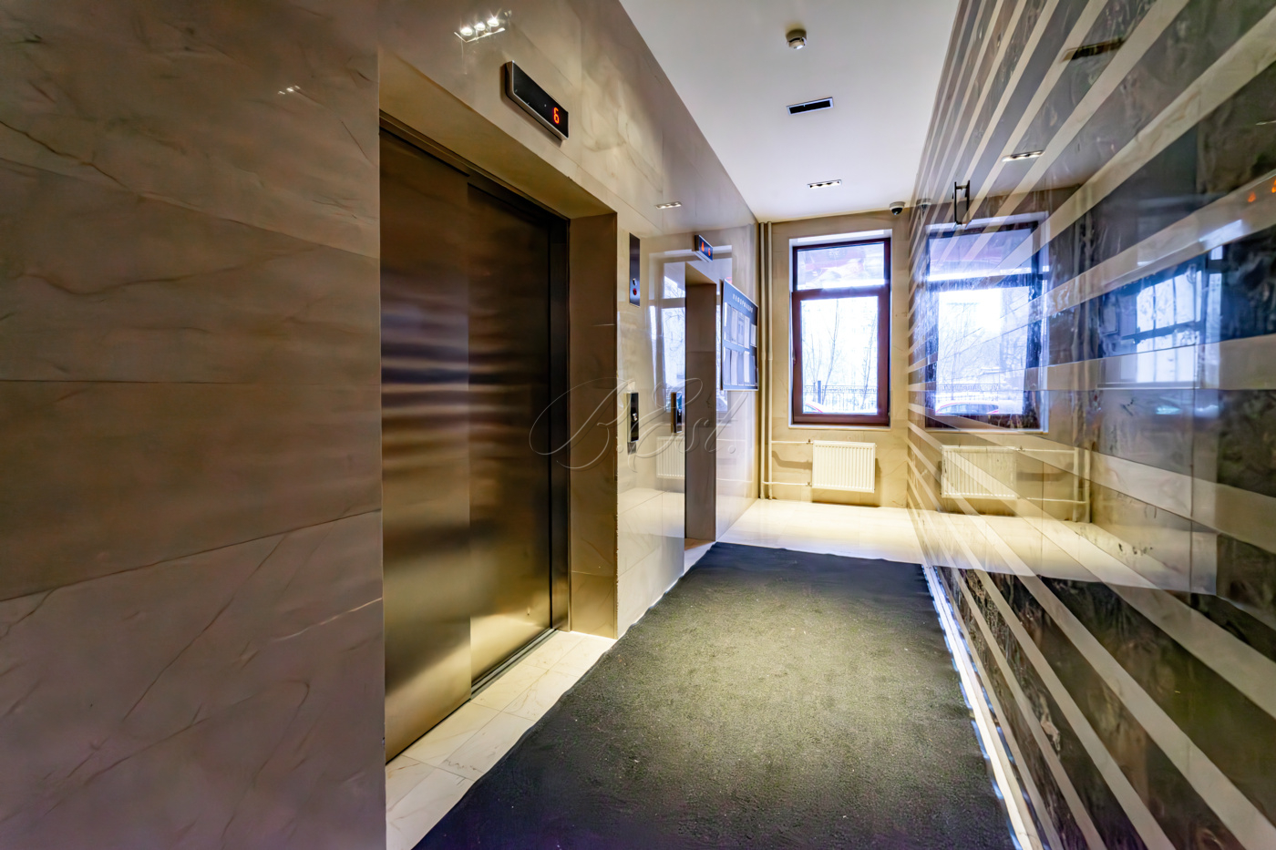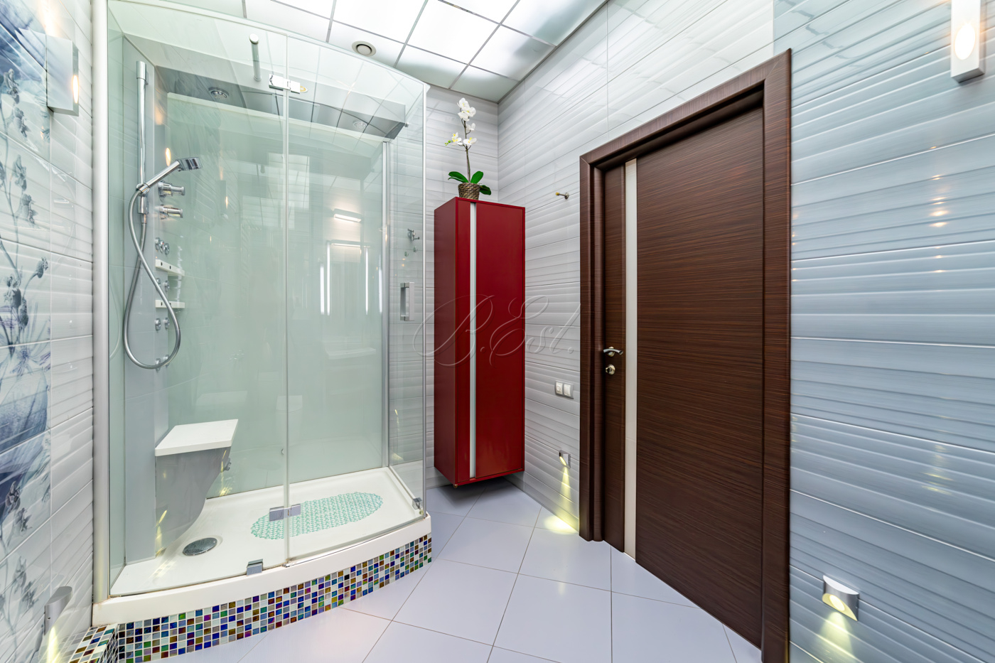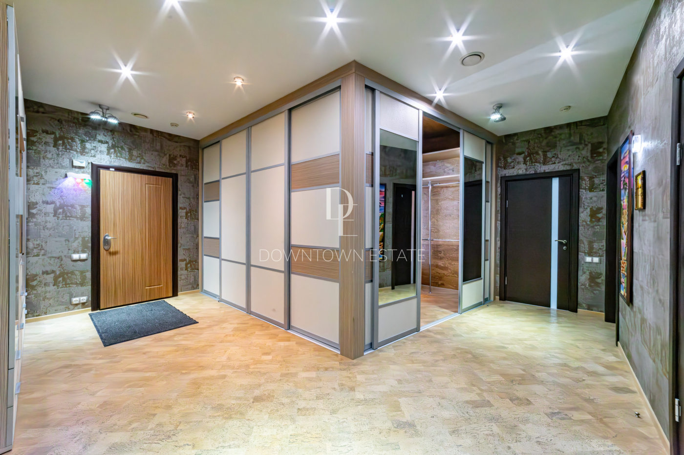 В отделке использованы высококачественные и долговечные материалы, выполнена шумоизоляция. Оригинальным решением является использование напольного покрытия из натуральной пробки во всех помещениях. Кухня со встроенной техникой: варочная поверхность Bosch, встраиваемые микроволновая печь и кофемашина Miele, вместительный холодильник Liebherr. Помещение постирочной со стиральной и сушильной машиными Miele. Душевая кабина Jacuzzi. Кондиционеры Daikin. Приточно-вытяжная система вентиляции с рекуперацией. Система очистки воды, охранная сигнализация.