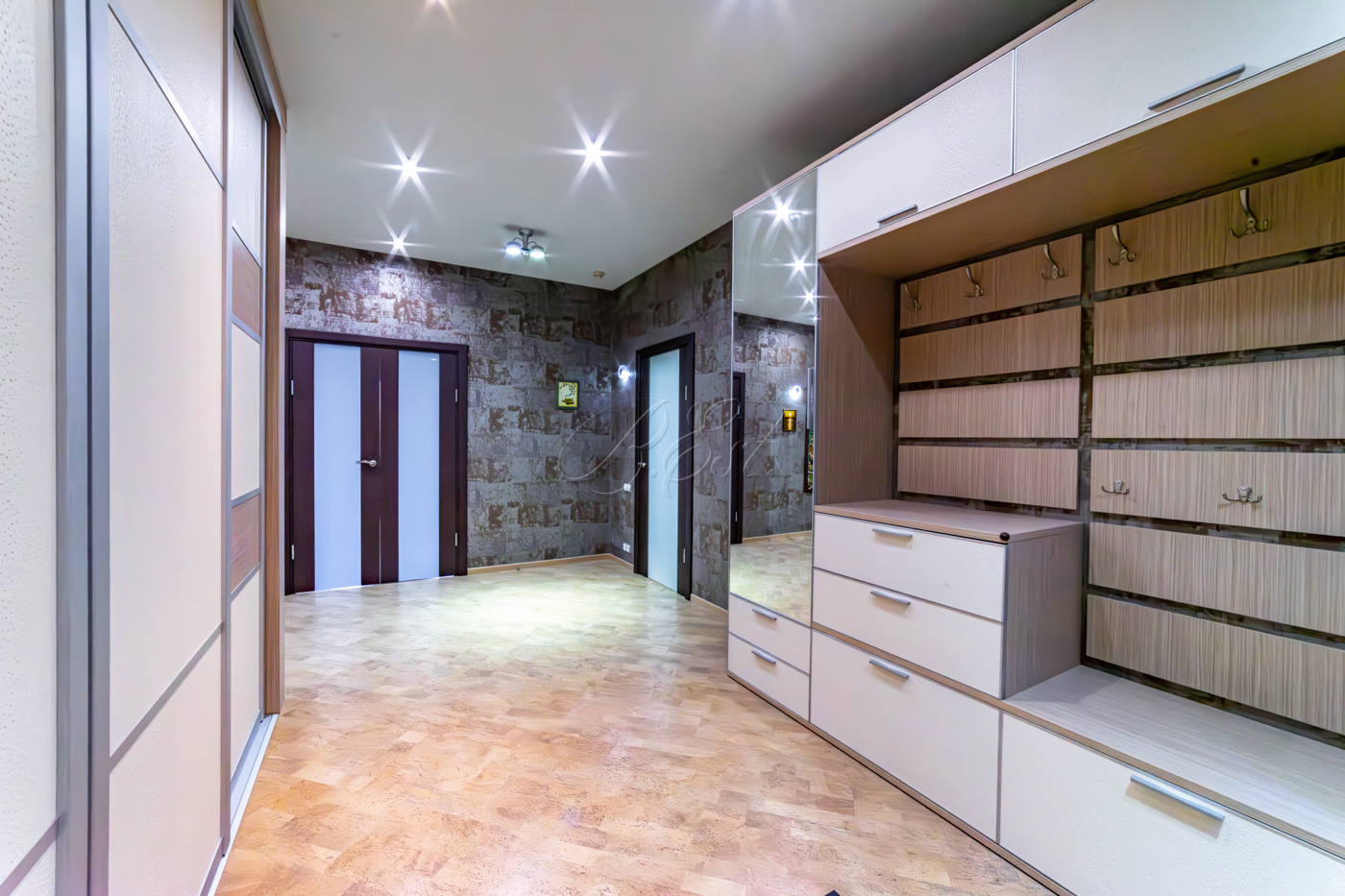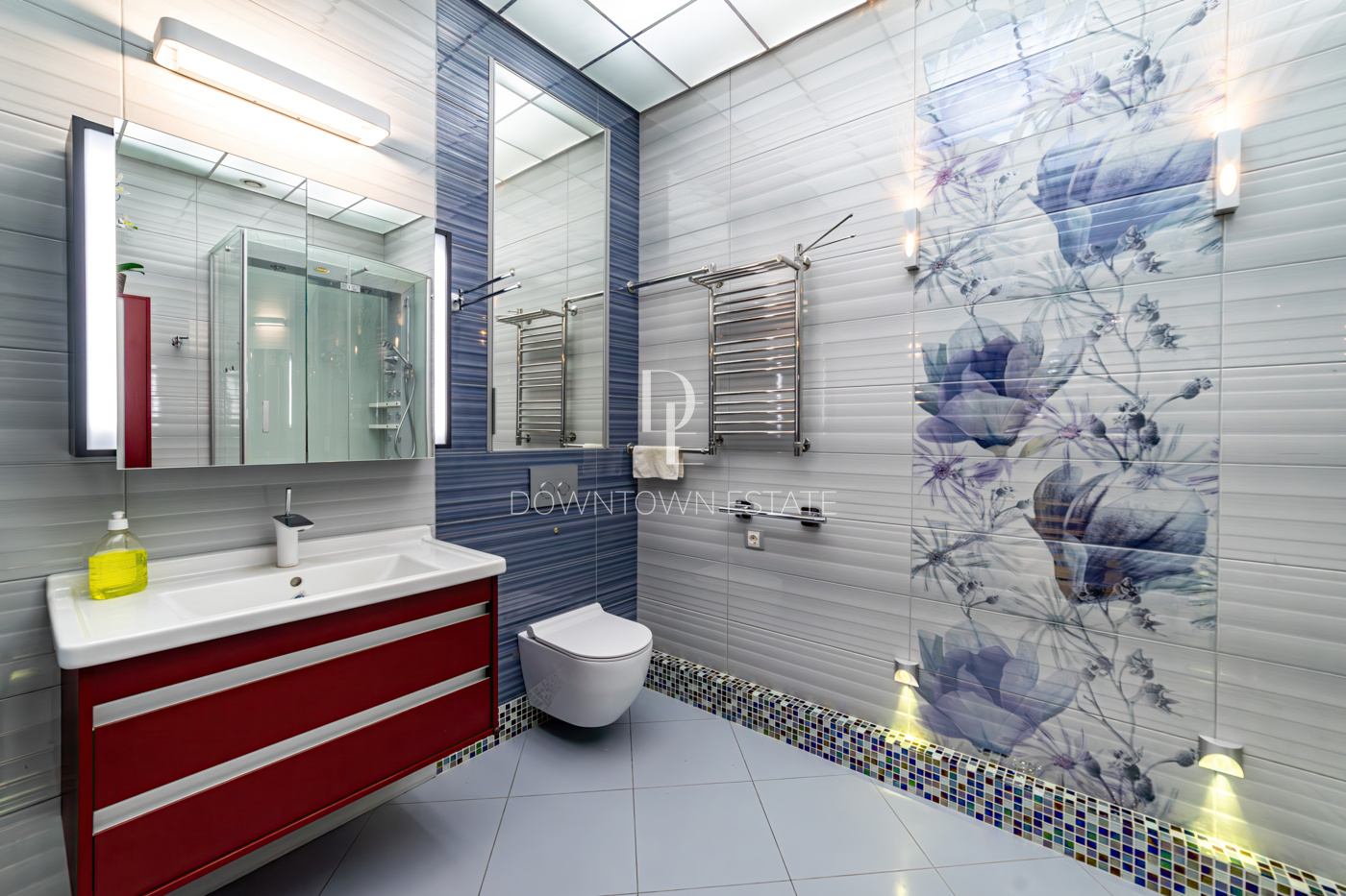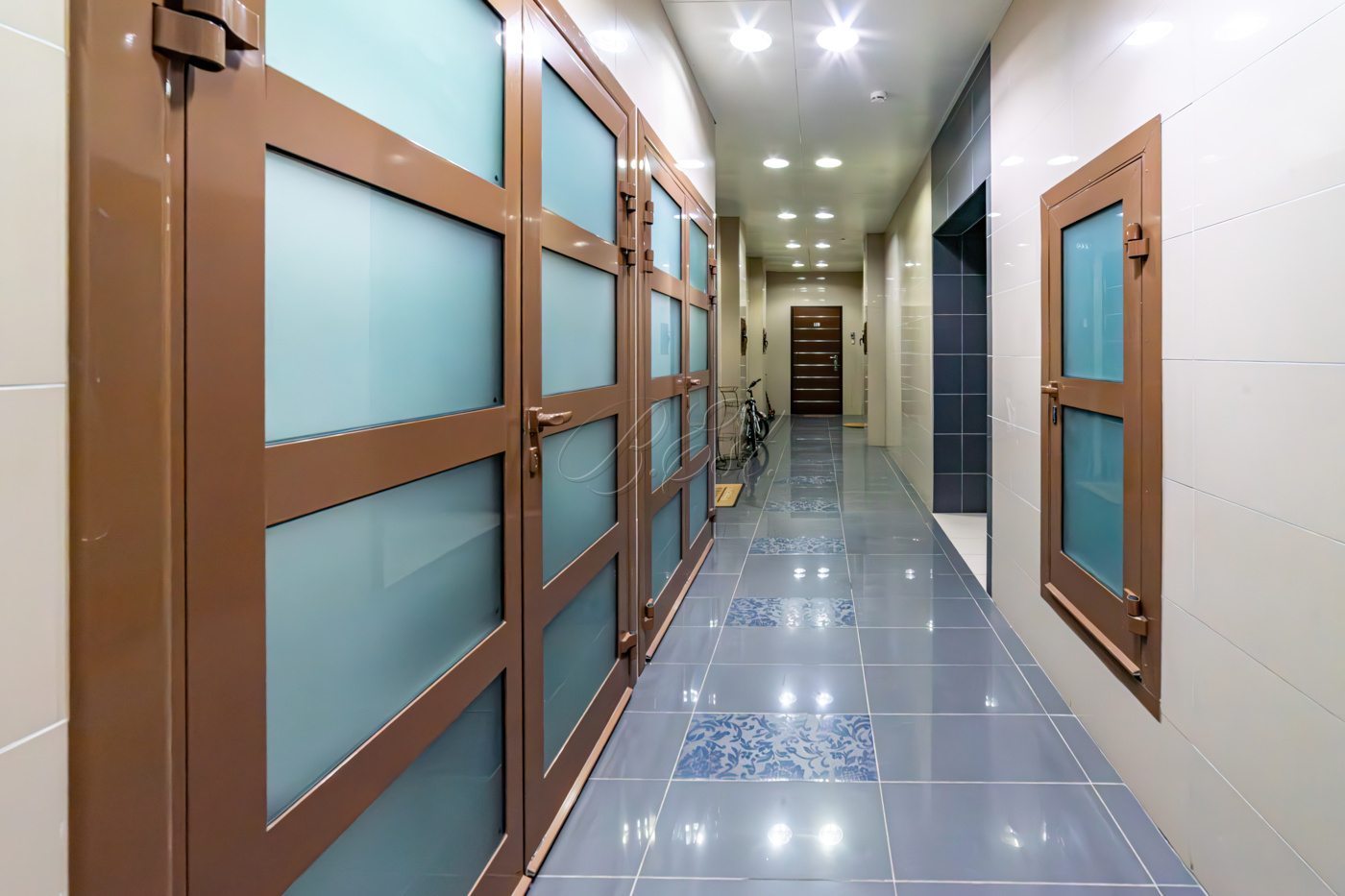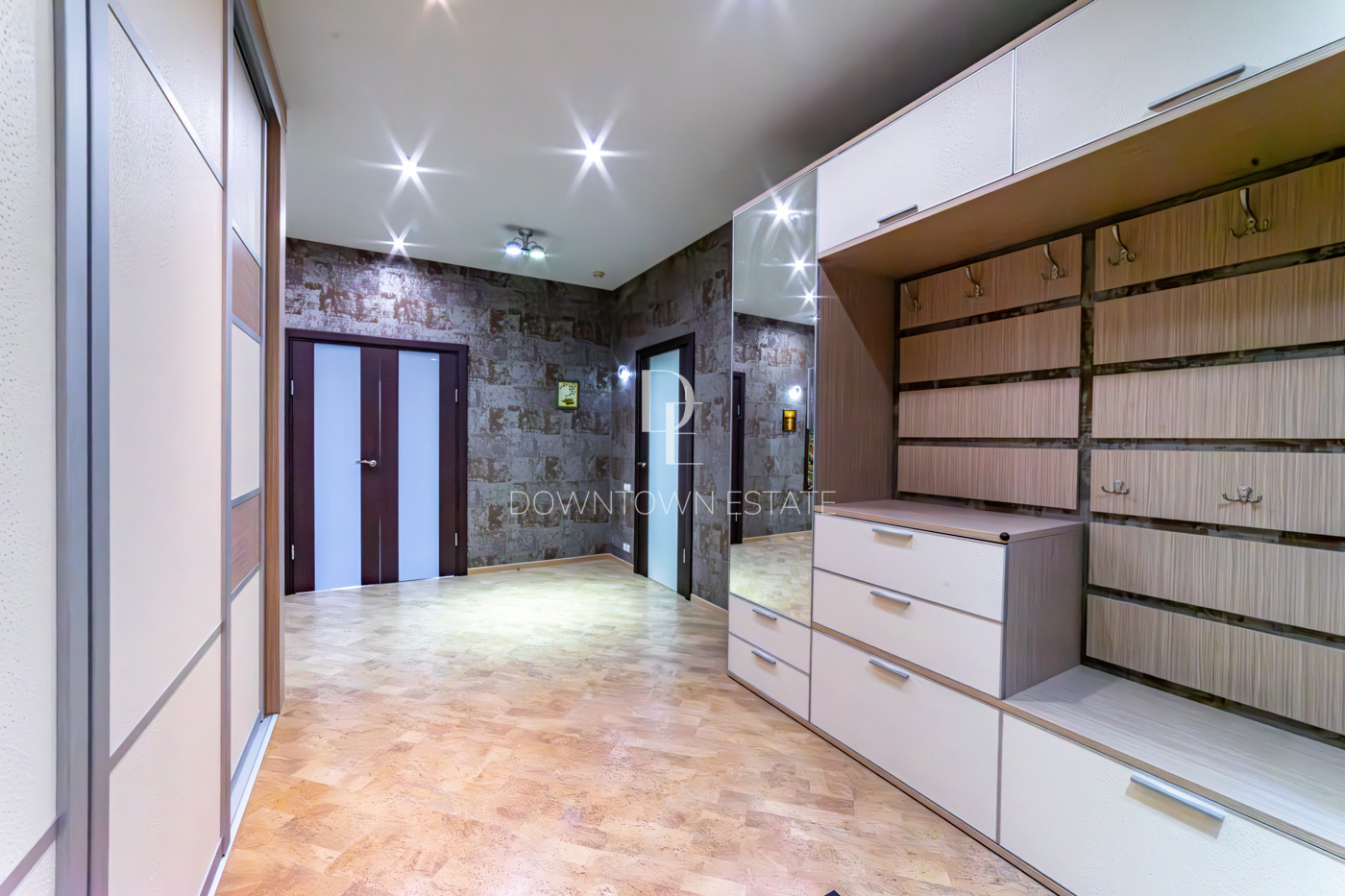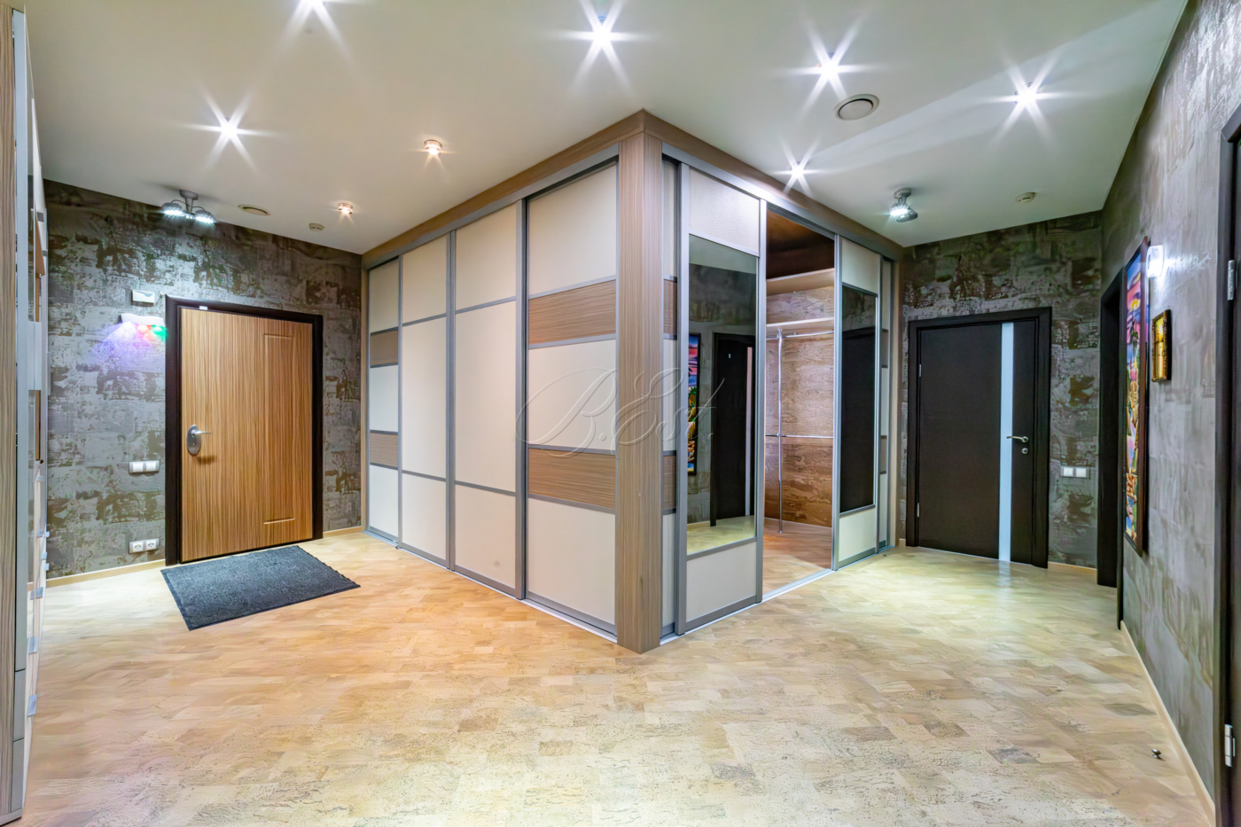 В отделке использованы высококачественные и долговечные материалы, выполнена шумоизоляция. Оригинальным решением является использование напольного покрытия из натуральной пробки во всех помещениях. Кухня со встроенной техникой: варочная поверхность Bosch, встраиваемые микроволновая печь и кофемашина Miele, вместительный холодильник Liebherr. Помещение постирочной со стиральной и сушильной машиными Miele. Душевая кабина Jacuzzi. Кондиционеры Daikin. Приточно-вытяжная система вентиляции с рекуперацией. Система очистки воды, охранная сигнализация.