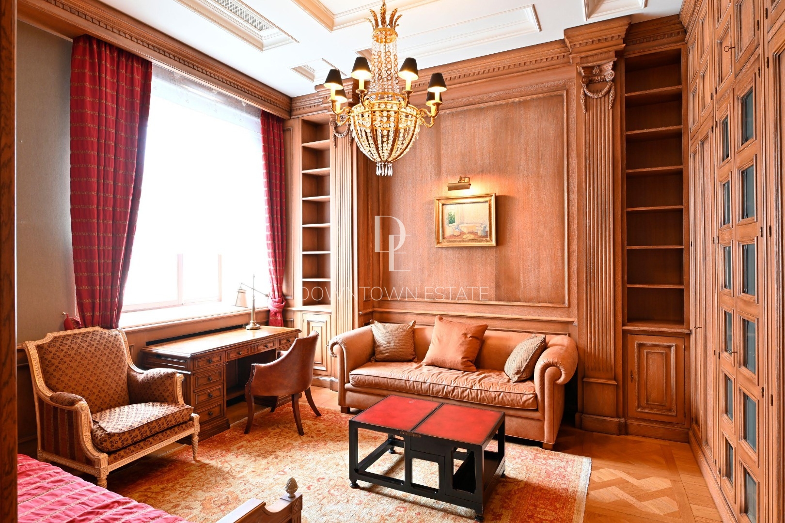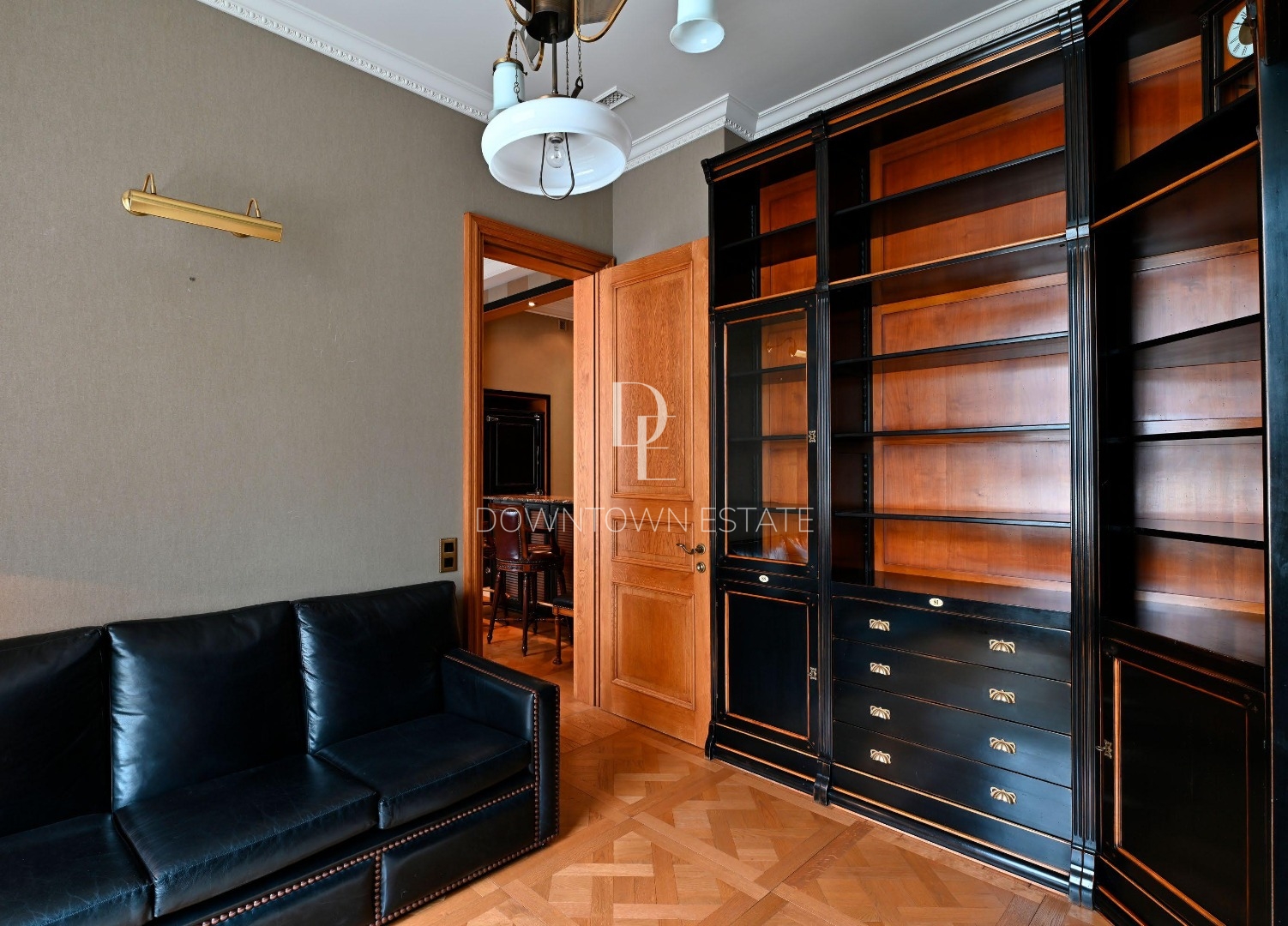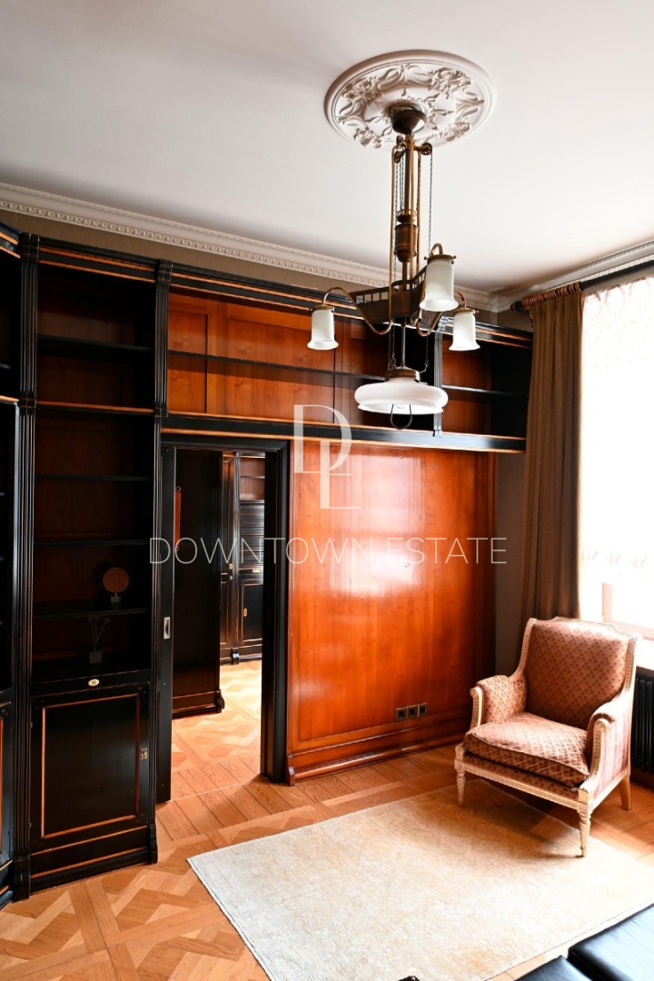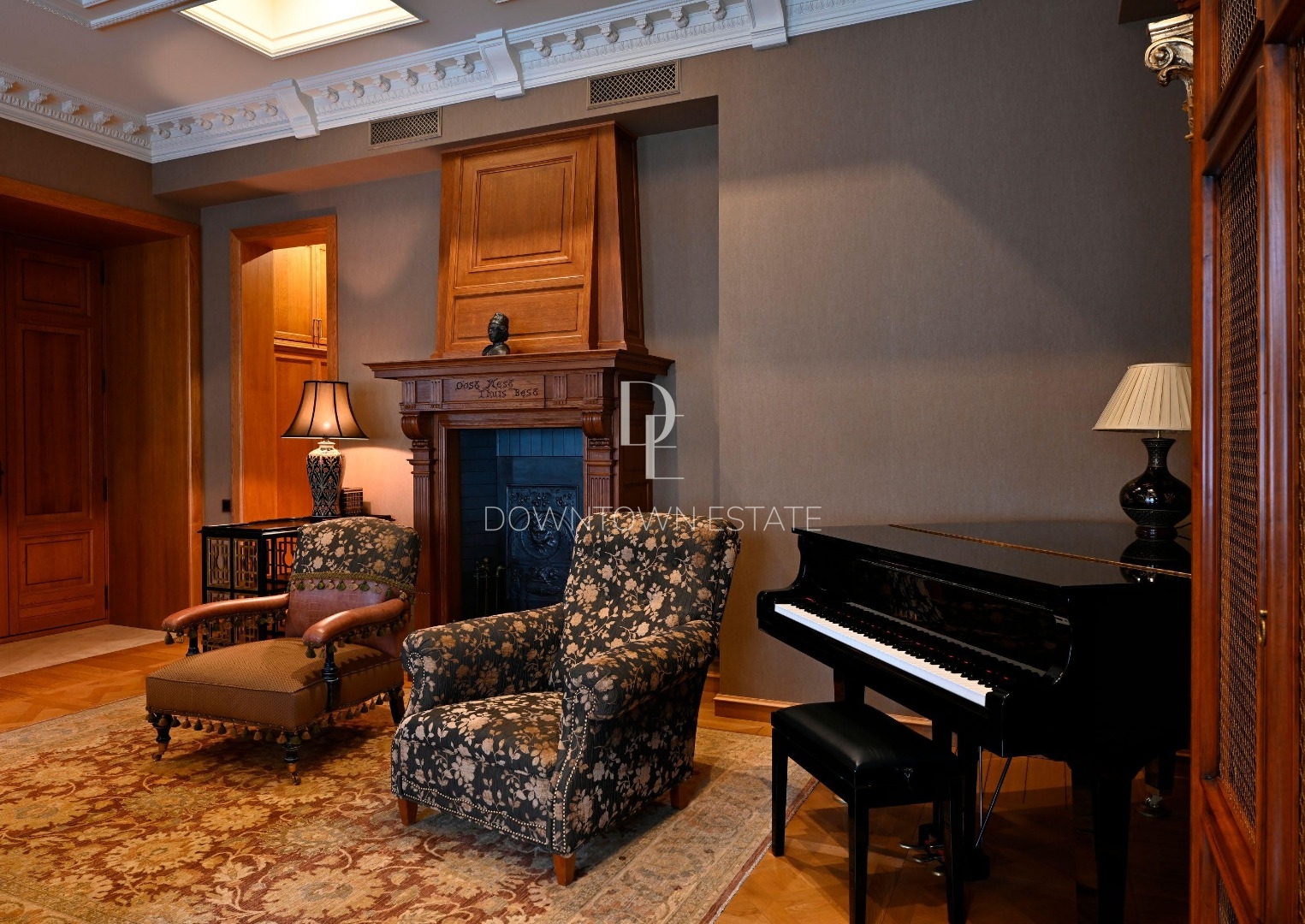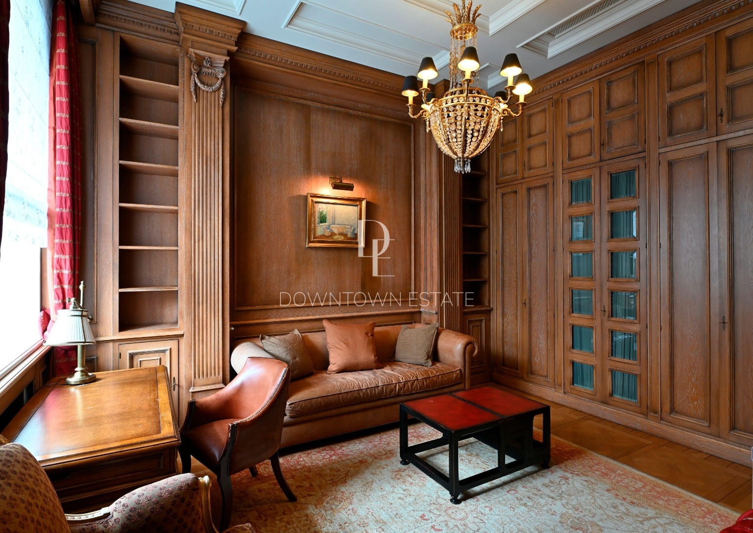 Объект 27389. Предлагается квартира в стиле американской классики с элементами антиквариата в историческом особняке на Малой Молчановке. Планировка: гостиная с декоративным камином, кухня-столовая, мастер-спальня с санузлом и гардеробной, спальня, кабинет, санузел. Высота потолков 4 метра. Виды из окон на Бельгийское посольство и во двор. Инженерные системы: приточно-вытяжная вентиляция, канальное кондиционирование.