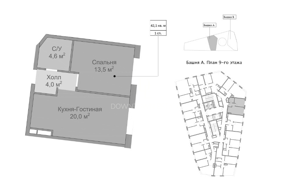 Продается однокомнатная новостройка, 42.1 кв.м., 9/21 эт